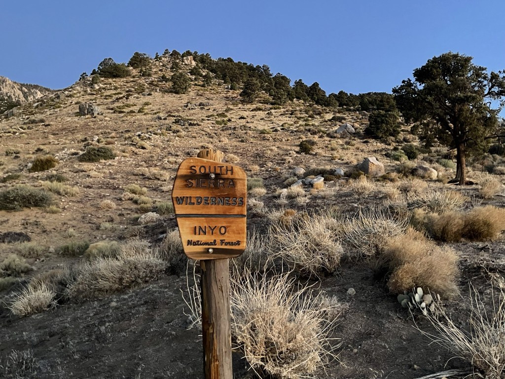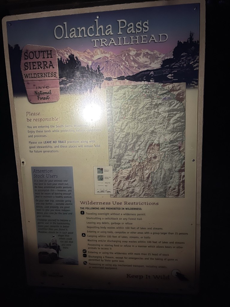 Olancha Peak is a 12,123 foot peak along the Sierra Crest in the southern part of the Sierra Nevada. It is the high point of the South Sierra Wilderness and is one of the most prominent peaks in the whole Sierra. In fact, it is one of only 5 peaks on the SPS list with >3000 feet of prominence. It is also the southern-most 12,000 foot peak in California. When driving north on US-395, it is the first major Sierra peak you will see. The trailhead lies at the end of Sage Flats Road southwest of the town of Olancha. Sage Flats road can be accessed from the 395 and is half paved and half well graded dirt. It should be possible for any passenger car to reach the trailhead. The standard route involves about 22 miles and over 6000 feet of elevation gain, so I wanted to get an early start. I had car camped at Horseshoe Meadow the night before, so I woke up early and made the 1 hour drive to the Olancha Pass Trailhead. It was still pretty dark when I arrived, but I had just enough light when I got started. I began this hike at 4:54am from 5831 feet above sea level.