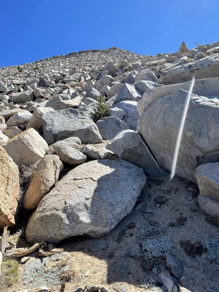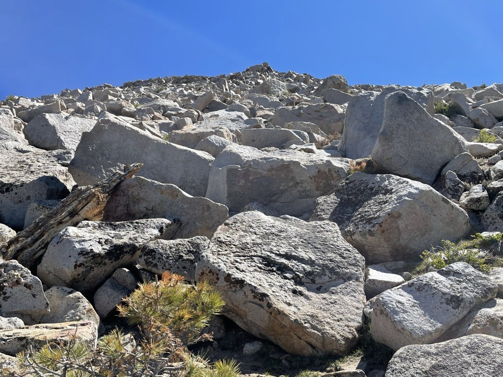 The tree line was around 11300 feet. From there it was all class 2 scrambling up the talus slope.