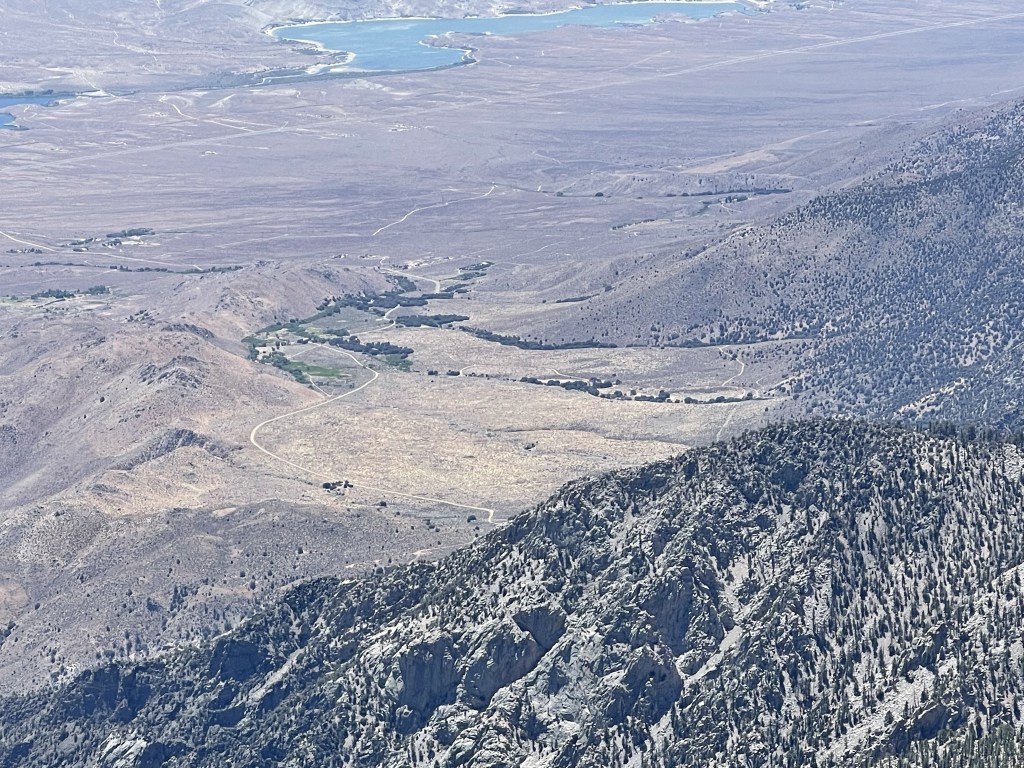 Down below I could see Sage Flats Road leading from Highway 395 to the trailhead.