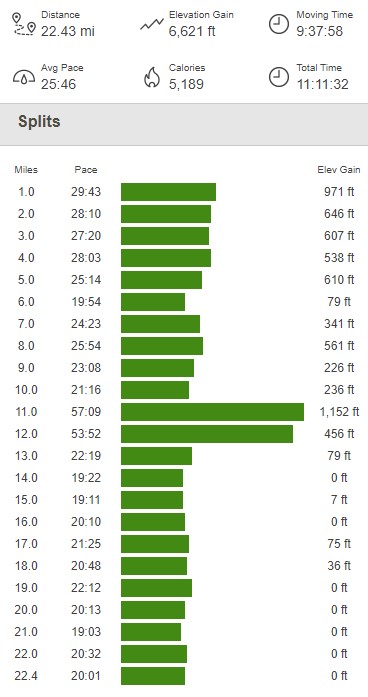 I finally made it back to the trailhead at 4:05pm. It was 98 degrees according to my car. This hike totaled 22.43 miles, 6621 feet elevation gain, and 11:11:32 total time.