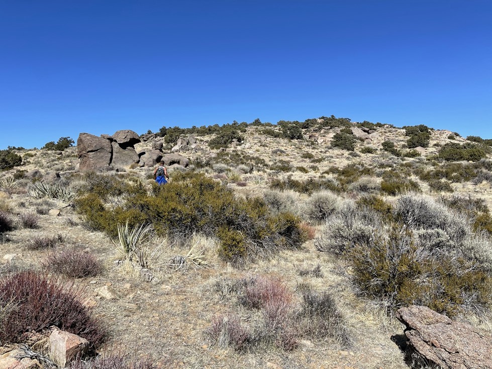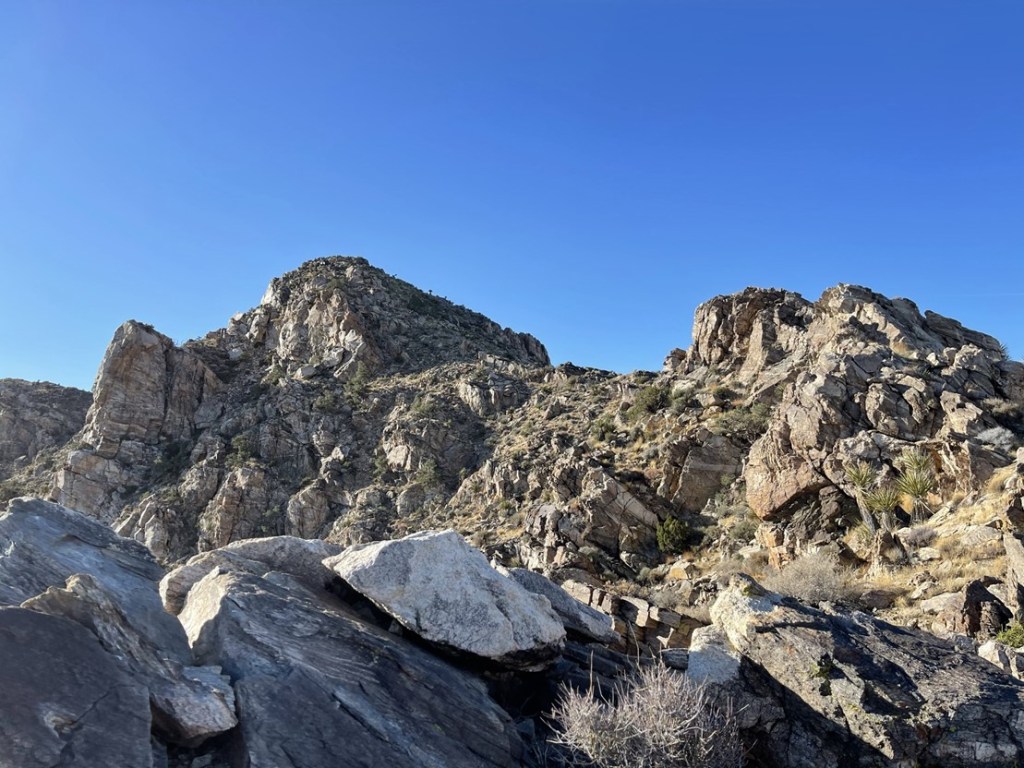 We hiked north across open desert. We had to go up and over a few undulations in the terrain. We eventually rounded the corner of a ridge and the peak came into view in front of us to the east. We realized later that the slope flattens out near the top, so we weren’t actually looking at the true summit from down below.