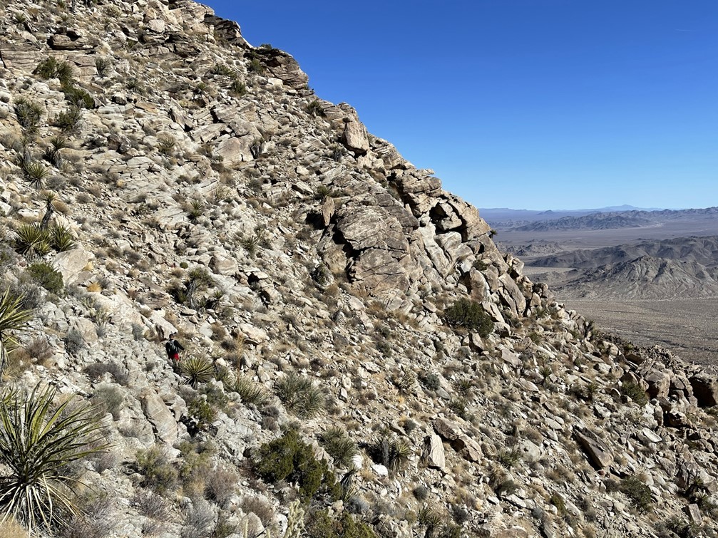 We followed our ascent route down the same ridge we had come up. We had a great view of the Kelso Dunes to the northwest. The Kelso Dunes are one of the main attractions in the preserve. I hiked to the highpoint of the dunes on the same day I climbed Granite and Silver in 2019.