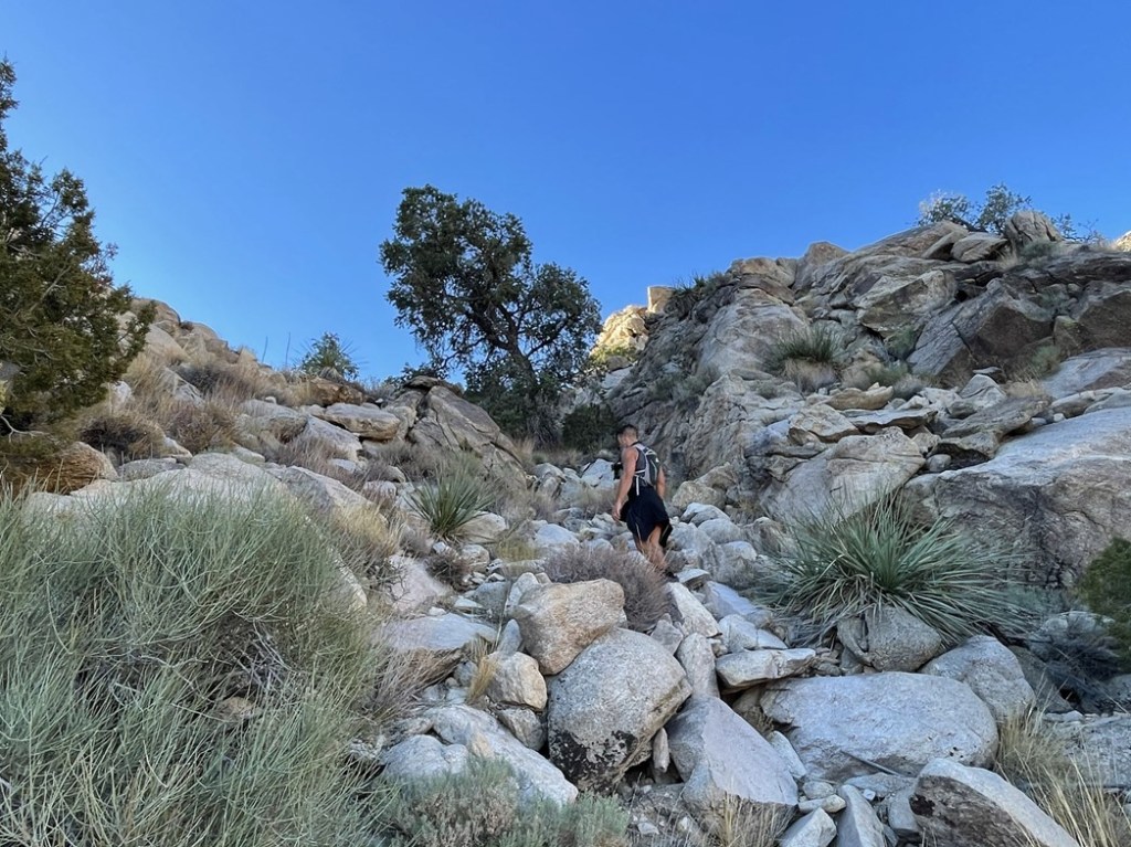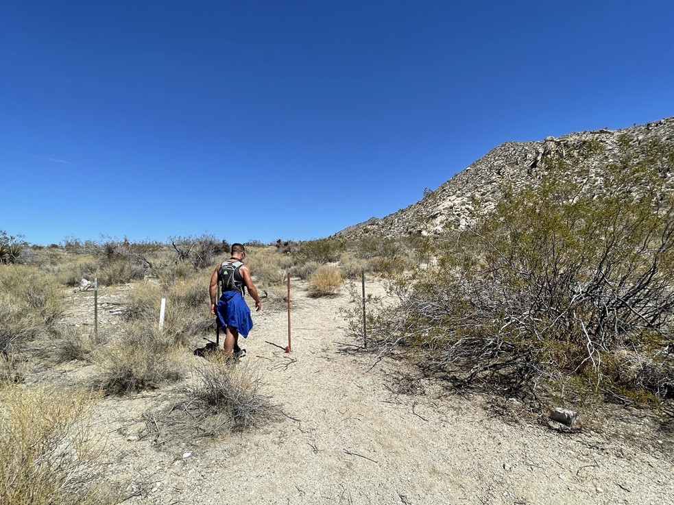 I woke up early the next day to make the rest of the drive to the trailhead. I drove to Amboy where I turned east onto the famous Highway 66. This section of Highway 66, referred to as the National Trails Highway, has mostly fallen into disrepair since it was bypassed by Interstate 40 to the north many years ago. The entire road is actually closed east of Kelbaker Road due to multiple bridge failures. As many peakbaggers have before me, I ignored the closures and drove around the barricades. The bridge failures were easy to go around since there are graded dirt roads that bypass each one of them. I went around a total of 4 bridge failures before turning southeast onto Danby Road. From there I drove a few miles, crossing a railroad track and a pipeline road, before reaching the gated wilderness boundary. Danby Road was in excellent shape and likely passable for a sedan. A few minutes later, my new hiking buddy Stav arrived in his jeep. Stav and I are both working on the DPS List and had been trying to plan a hike together for a few months. We finally found a weekend that works for both of us, and we decided on doing Old Woman since it is one of the few DPS peaks we both still needed that was also a reasonable driving distance for both of us. We began hiking at 7am from 2490 feet above sea level.