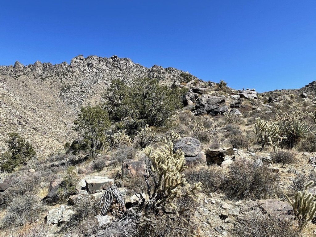 It was still very early in the day so we discussed what our next move would be. We had previously discussed doing nearby Ship Benchmark or Clipper Mountain. We decided Ship would be too short and Clipper sounded like it had a pretty rough drive in. We instead opted to do Providence Benchmark (6611 feet), which is 2k prominence peak in the Providence Mountains of Mojave National Preserve. We drove back to Route 66 and went east to Essex Road. We bypassed a few more bridge failures in the process. We then drove north on Essex Road to I-40. We passed a Highway Patrol SUV on Essex Road which concerned us a little since we were driving on a closed road but thankfully, we weren’t stopped. We drove west on I-40 and then north on Kelbaker Road. We entered Mojave National Preserve on Kelbaker and then drove about a mile east on a dirt road where we parked. This road was in decent shape, but I’d recommend high clearance for one portion that crosses a wash. We began this hike at 12:31pm from 3814 feet above sea level.