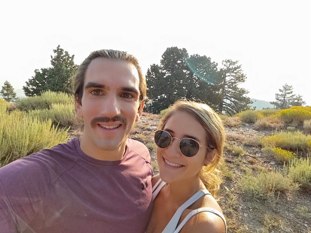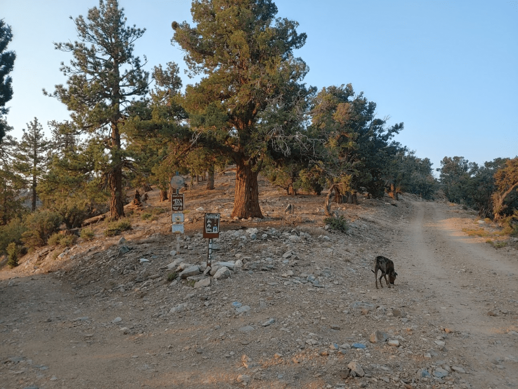 Onyx Peak (9113 feet) is a peak on the Sierra Club HPS List in the eastern part of the San Bernardino Mountains near Highway 38. I was spending the weekend up in Big Bear with my girlfriend, Alexia and our dog, Stella, and we decided that Onyx would be a nice peak for the 3 of us to tackle together. We were in the middle of some very warm and humid August weather, so I wanted to get as early of a start as possible for Stella’s sake (she doesn’t do well in the sun). We left our cabin in Big Bear Lake around 5:30am and made the quick 20 minute drive to the trailhead for Onyx, which is a large dirt turnout on the side of the highway. We started hiking at 6am from 8401 feet.