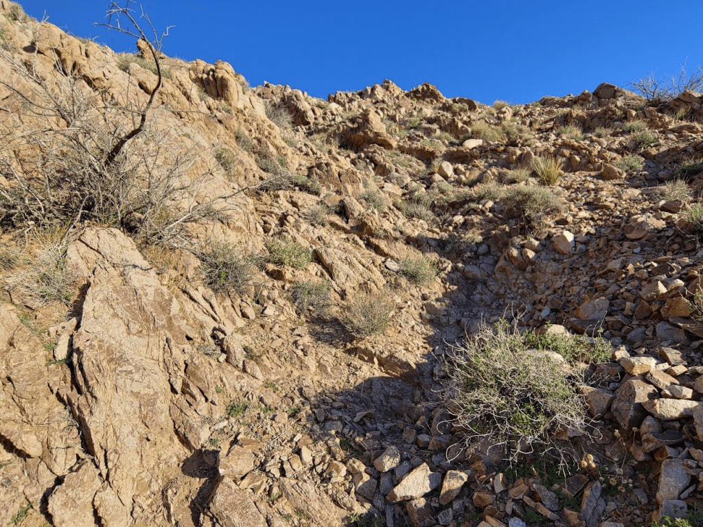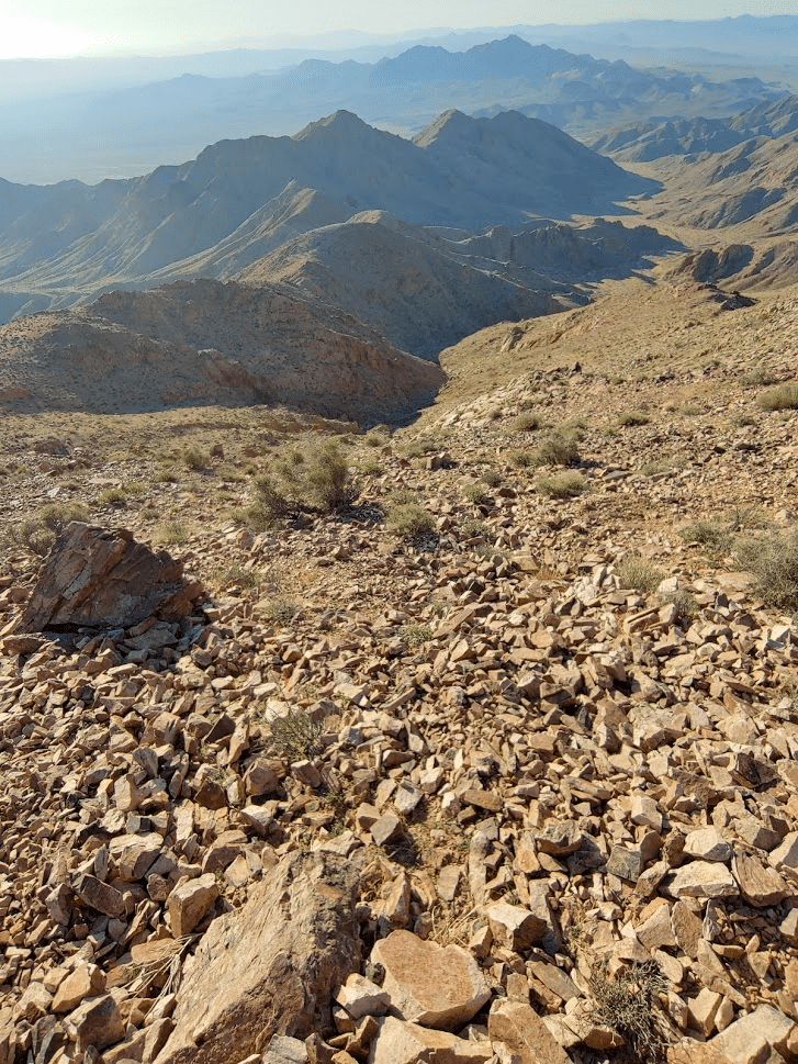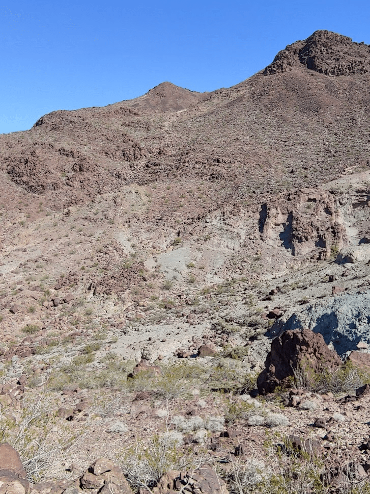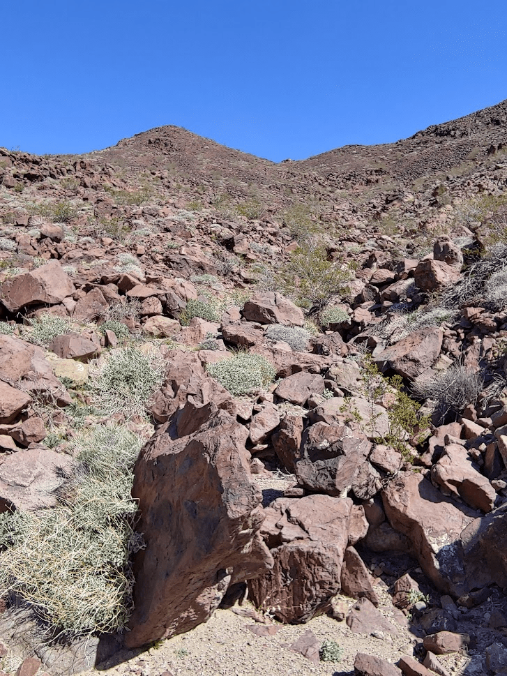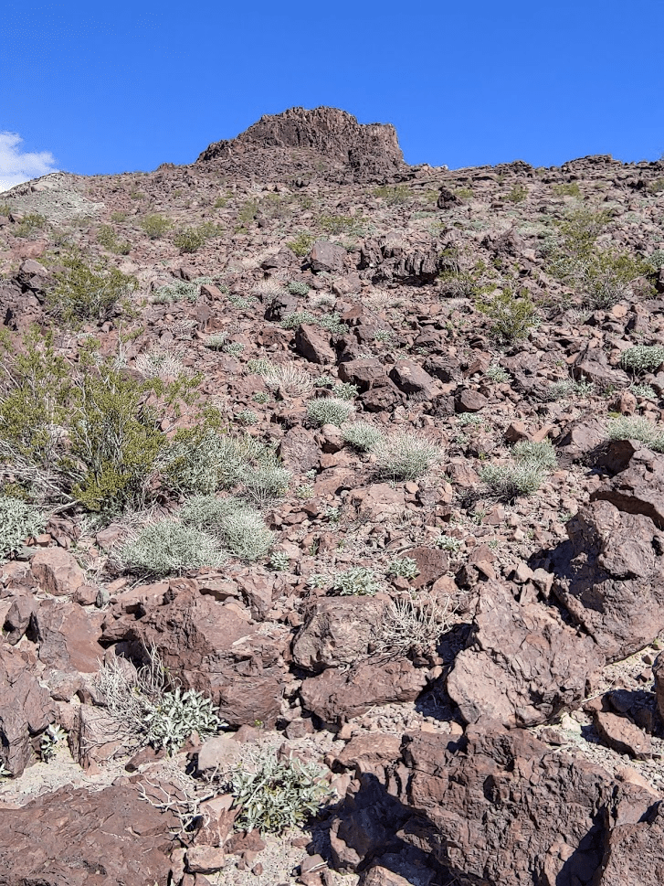 Eventually the wash peters out and I started climbing up a steep slope of loose rock towards a false summit.