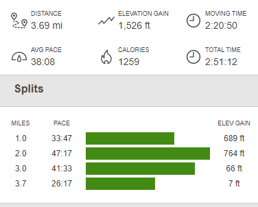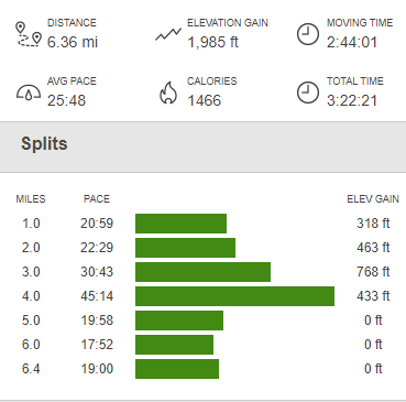 This hike totaled 6.36 miles, 1985 feet elevation gain, and 3:22:21 total time.
