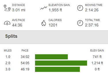 I made it back to the car just before 9, taking just over an hour to descend. The hike totaled 3.01 miles, 1955 feet elevation gain, and 2:37:16 total time.