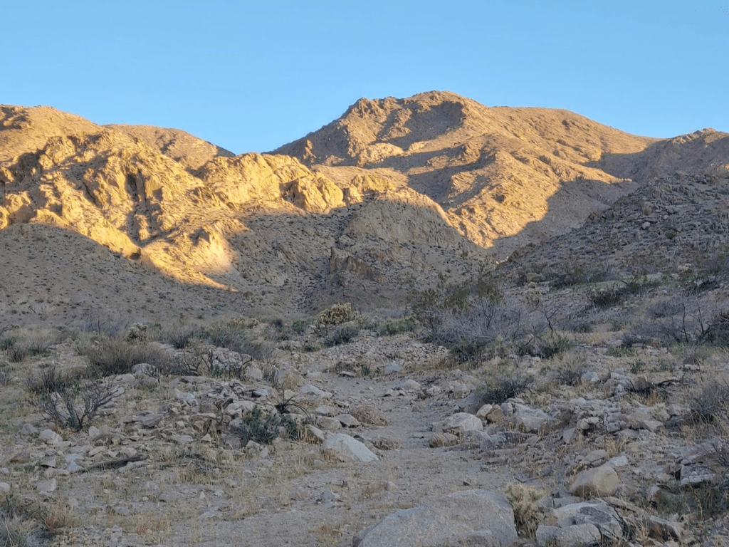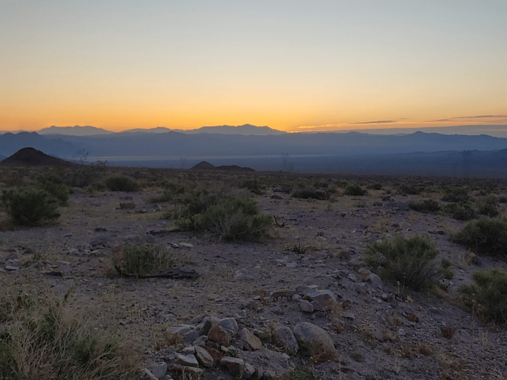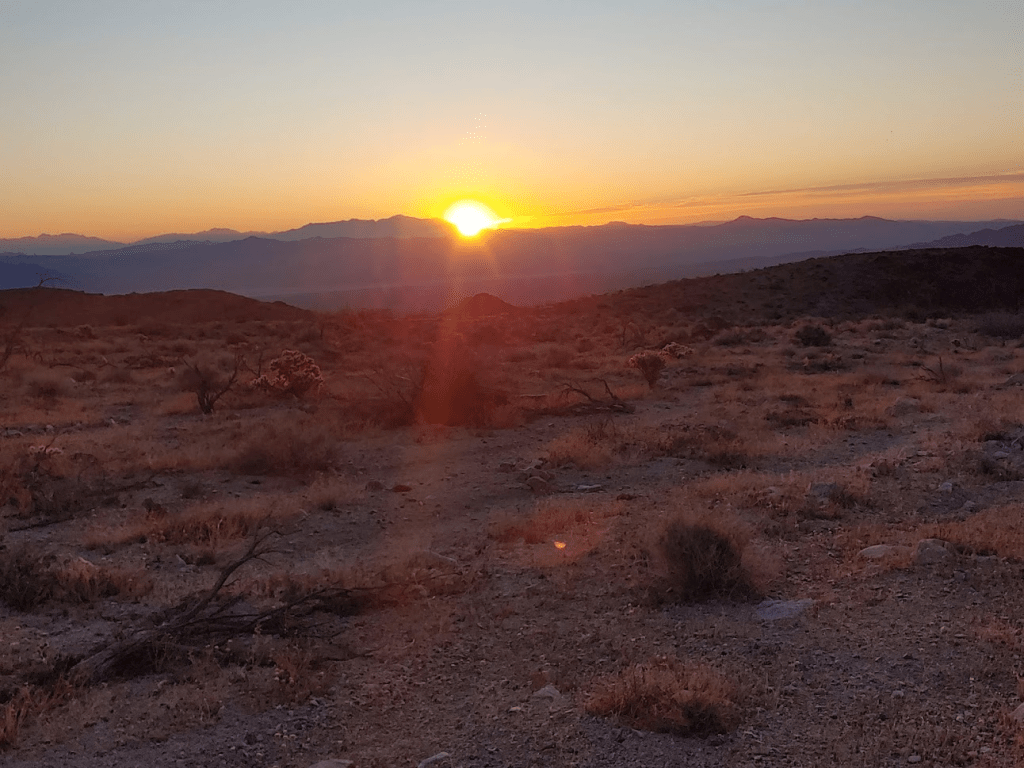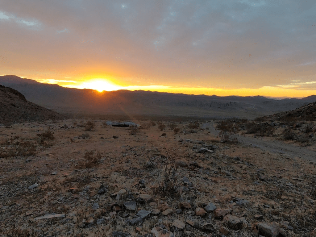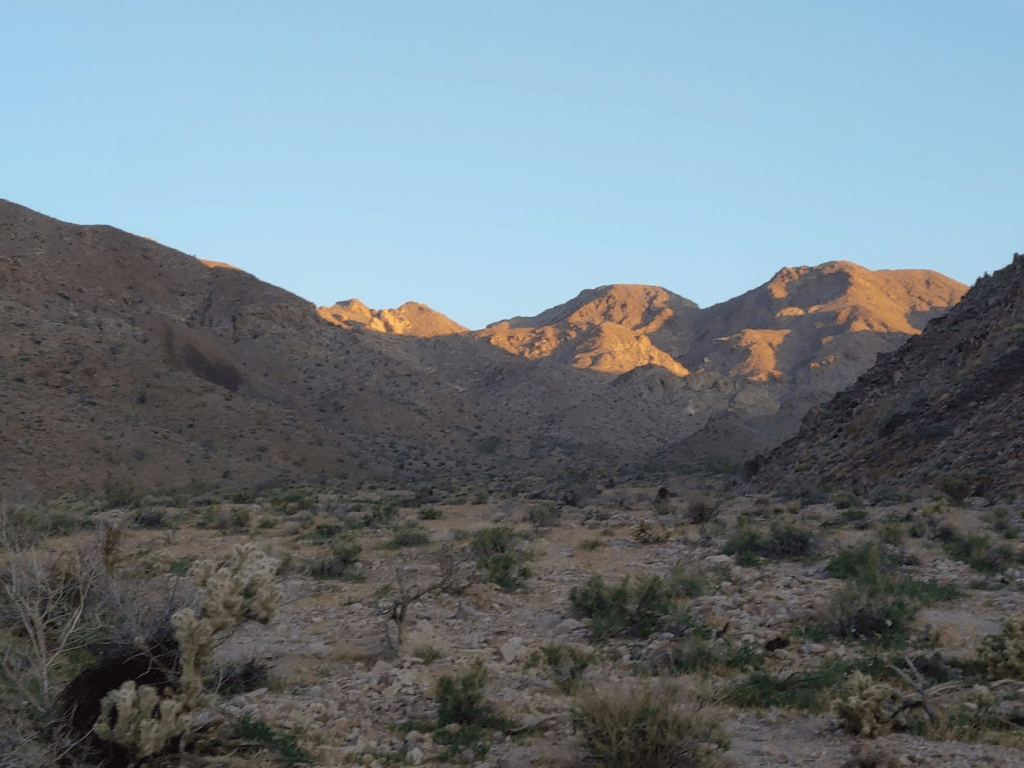 I woke at 5:15am after an okay night of sleep. Around 1am, the wind really picked up and woke me up a few times over the next hour or so. I was thankful the wind was no longer howling when I woke up, although it was much colder than the previous morning. At 4627 feet, Cady Peak is the high point of Mojave Trails National Monument. This National Monument was created under the Obama administration and protects a huge chunk of undeveloped land in the Mojave Desert. Curiously, Zdon doesn’t include Cady Peak in his book, despite it having over 2000 feet of prominence and being a range high point (National Monument status would have occurred after he wrote his book). The first signs of dawn were materializing behind me as I began hiking at 5:57am.