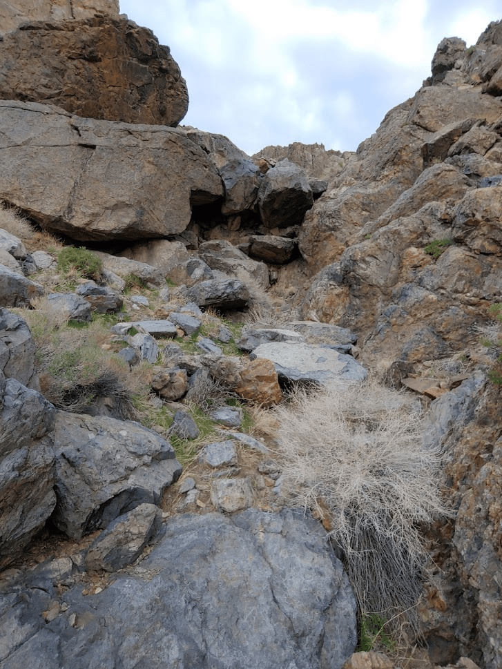 I made pretty good time up the wash as I neared the top. The summit rocks are visible on the right.