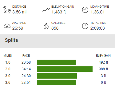 I reached the car at 4:37pm. This hike was 3.56 miles, 1483 feet elevation gain, and 2:09:03 total time.