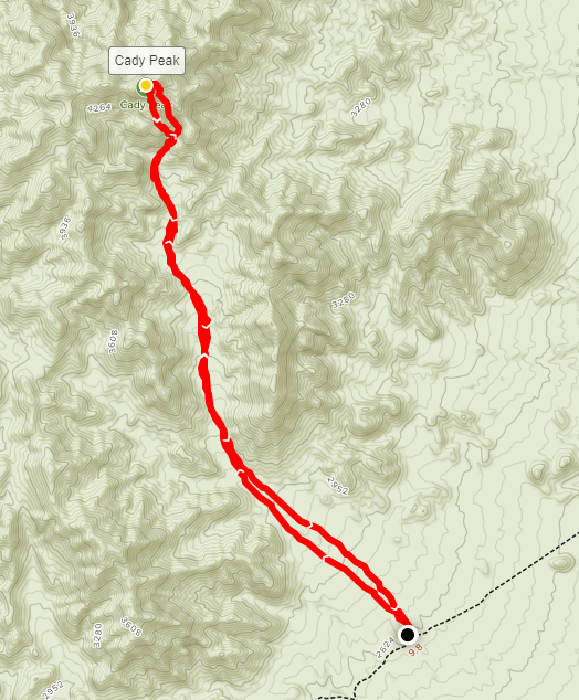 What a day! I was extremely happy to have summited all 3 Ords, and it wasn’t even 5 o’clock yet! I headed back out to Highway 247 and then went north until I hit Barstow. While Barstow is a just small town by most people’s standards, it actually is one of the largest cities in the Mojave Desert. At the intersection of I-15 and I-40, it gets a ton of freeway traffic, especially for those travelling between Los Angeles and Las Vegas. While in Barstow, I checked the forecast for the next day and it seemed like I would be okay to do some more hiking the next day, at least for the morning. I settled on doing 2 peaks east of Barstow along I-40, Cady Peak and Sleeping Beauty. I ate dinner at Chipotle and the took off down I-40 towards the trailhead for Cady Peak. I exited the freeway at Hector Road and then took an immediate left on the National Trails Highway, which is the remains of old Route 66. I followed this road east as it parallels I-40 for a few miles and then turned left onto Pisgah Crater Road. This road goes underneath I-40 and curves around to the west and parallels I-40 in the opposite direction for a mile where the pavement ends. I then turned right onto a power line road and drove for about 6 miles and parked underneath Tower 734. The road was smooth and probably passable for any car. I was asleep before 9.