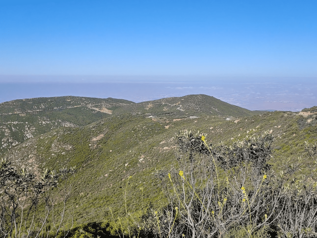 As we got near Peak 3162, we left the road to climb up to the peak. It was steep, but it was a very short bushwack. We reached the peak at 8:30am after 3.89 miles. We had a nice view here of Tijuana. The border wall was very visible, even from so high up.