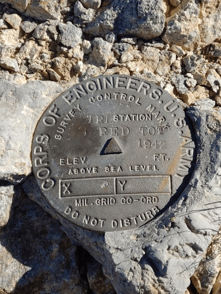It was very windy on the summit, so I bundled up to stay warm. I signed the register and noted I was the first person to summit since December 2019, nearly 1 year ago! I located the “Red Top” benchmark and 2 reference markers.