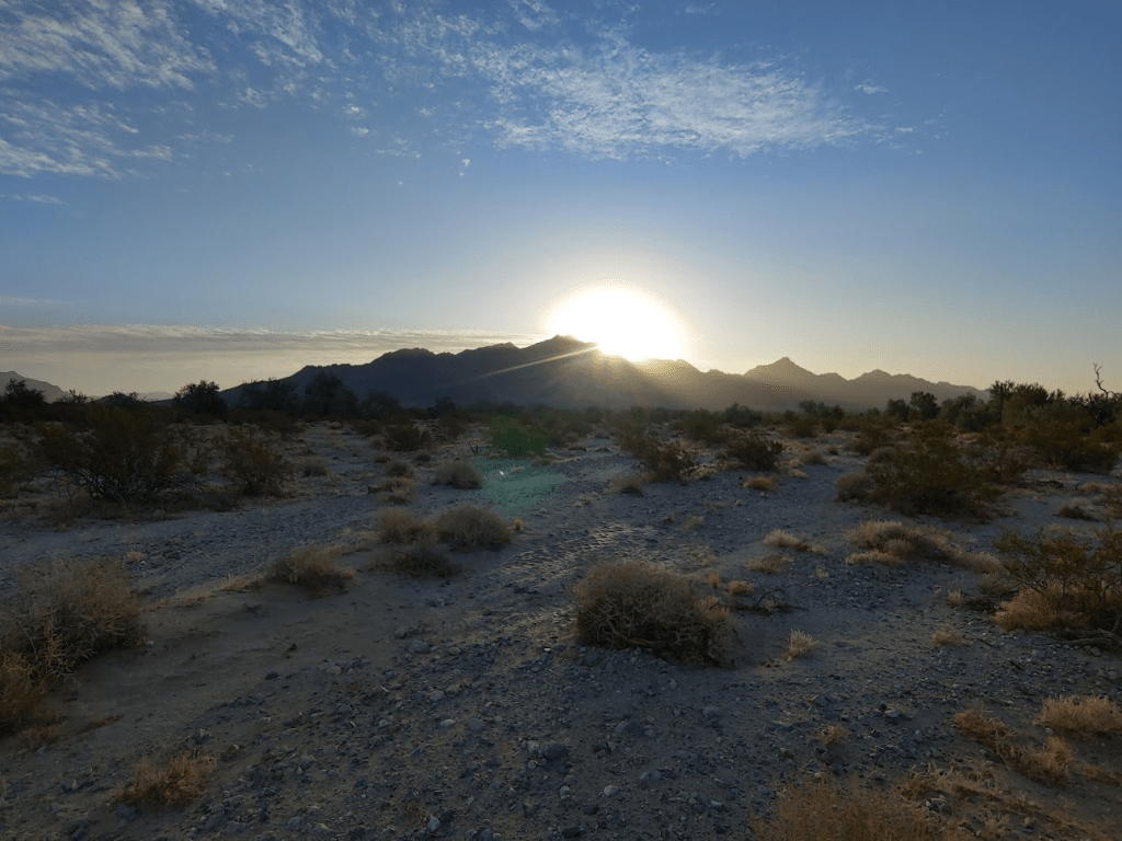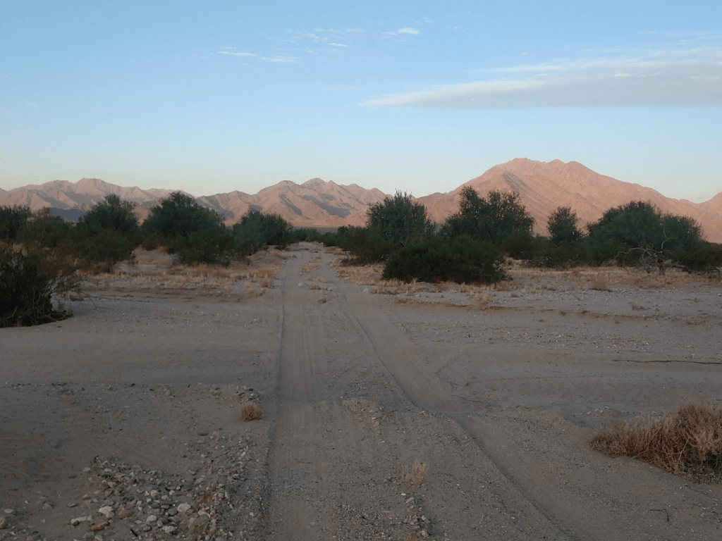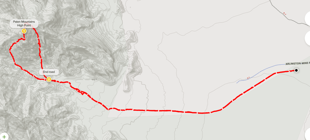 I woke up the next day at 4:15am and continued driving. I was planning to climb Palen Mountains High Point (3848 feet). The Palen Mountains are a remote desert range about 30 miles northwest of Blythe. The high point of the range is a 2k prominence peak and is on the DPS list as well as Andy Zdon’s list of desert summits. There are western and eastern routes up to the top, both involving long, rough approaches on dirt roads. I was doubtful that either approach was suitable for my Forester, but the eastern approach appeared to be in good shape until the last few miles, so I figured I could simply walk the extra distance. Plus, the eastern approach would put me closer to other peaks I was hoping to do this weekend. I took Lovekin Blvd north out of Blythe where it eventually turns into Midland Road. I then turned left onto Arlington Mine Road which I took west for about 13 miles and then parked. There is an active mine in the area so most of this road is graded. The first 7 miles is very wide and smooth so you can drive 40 mph on it. The next 5 miles are a little rougher but still passable for any car. The last mile until where I parked got pretty sandy and bumpy. This road continues for another 5ish miles to the base of the Palen Mountains, but I parked here and started hiking at 6:17am from 919 feet.