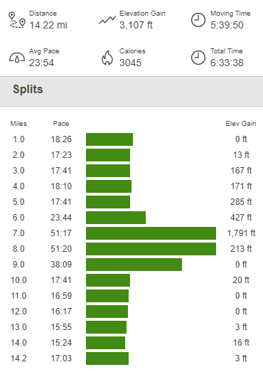 The hard part was over, but it was still 5 more miles back to the car. I made good time and reached the car again at 12:51pm. This hike totaled 14.22 miles, 3107 feet elevation gain, and 6:33:38 total time.
