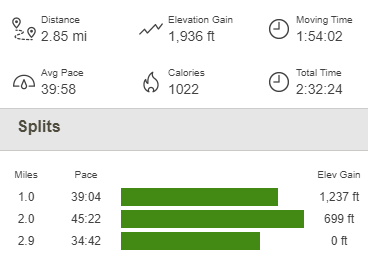 I reached the car again at 4:28pm. This hike totaled 2.85 miles, 1936 feet elevation gain, and 2:32:24 total time.