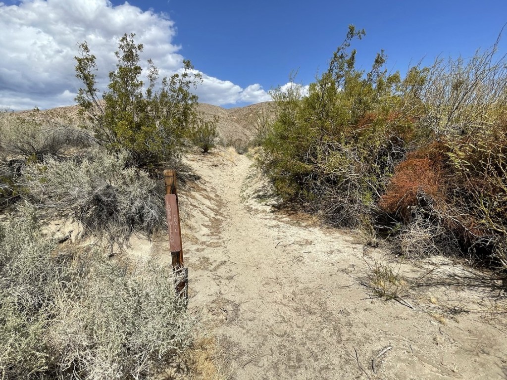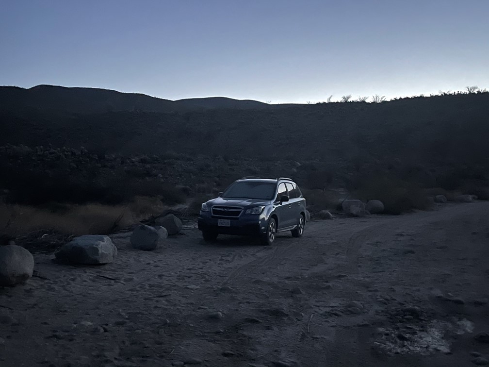 My plan for Sunday was to climb 4 more peaks on the San Diego 100 Peaks List: Palms Benchmark (3121 feet), Elder Benchmark (3433 feet), Collins Benchmark (4559 feet), and Knob Benchmark (3431 feet). The 4 peaks rise above the Collins Valley on its western side and are only a mile or so north of Square Top, which I had just climbed the day before. I had slept the night before at a turnout along Coyote Canyon Road, so I only had a short drive before I started hiking. I made it to the creek crossing and parked there. Note this is signed as the 3rd creek crossing, but I think the first 2 crossings are dry. I had hiked through the creek the previous day on my way to Square Top, so I knew the water was too deep for my Subaru. I started hiking at 6:12am from 1145 feet above sea level.