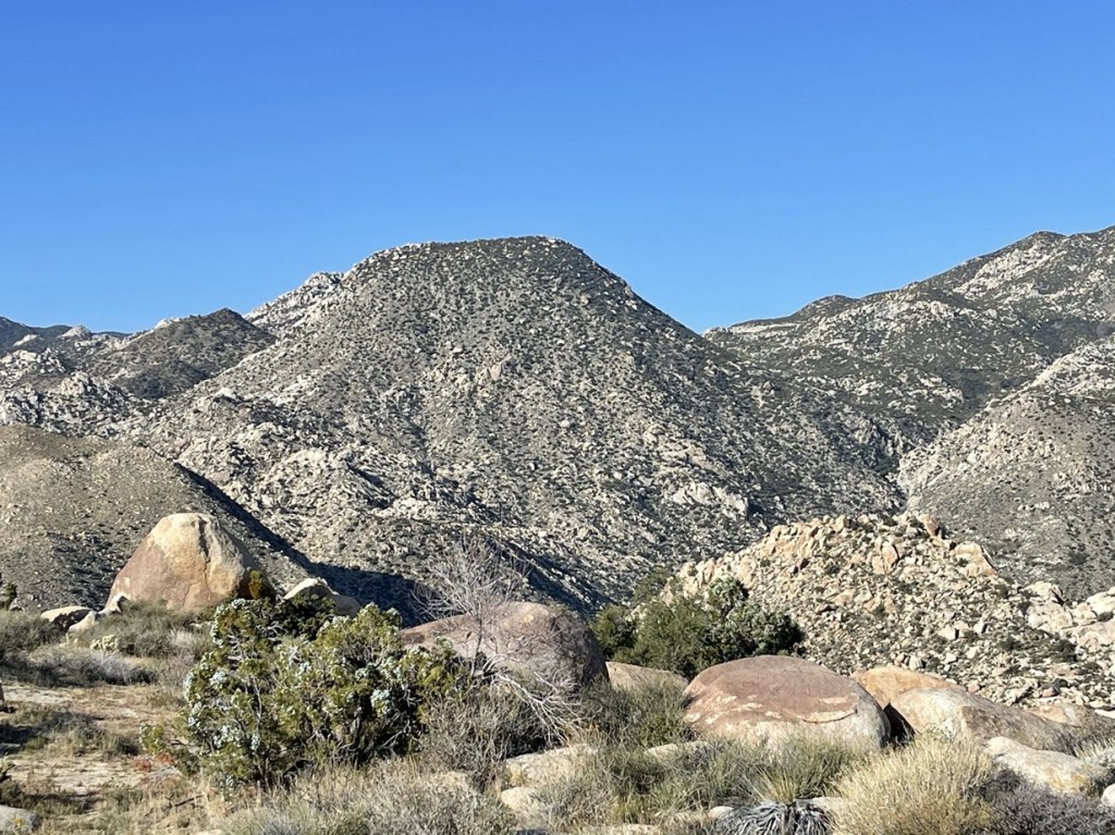 I reached the road again at 2.6 miles. I could see the first 2 peaks directly in front of me. Palms Benchmark is center and Elder Benchmark is right. The other 2 peaks are further back so not visible from down below. Square Top is on the left.