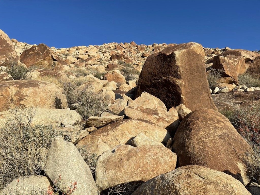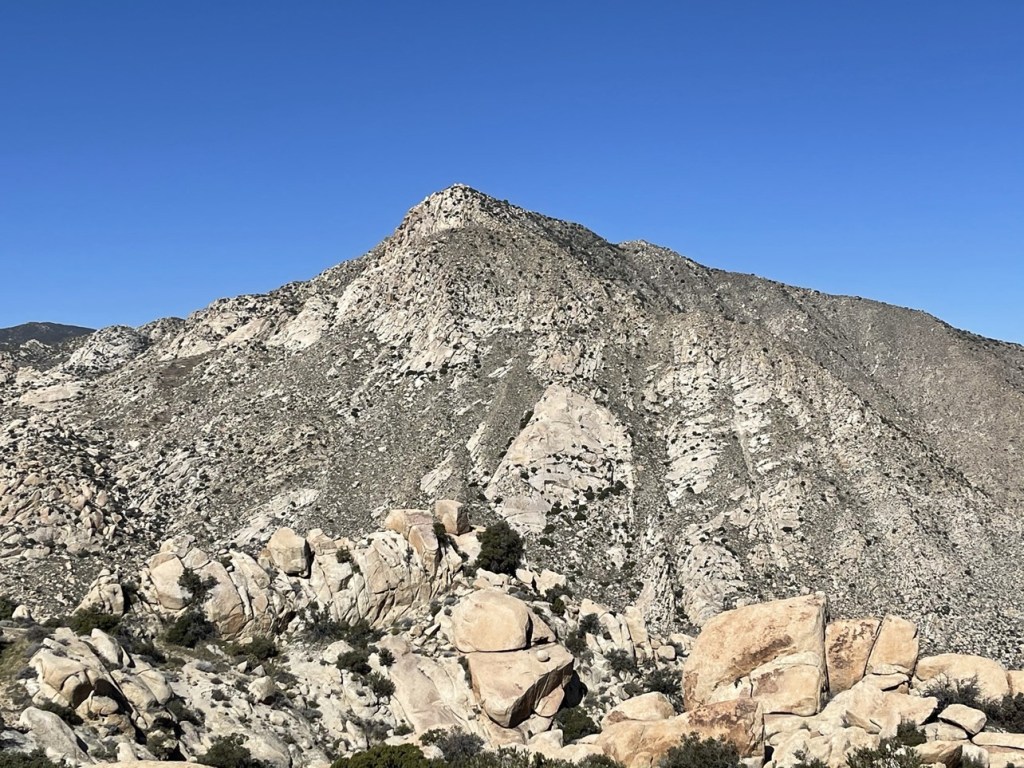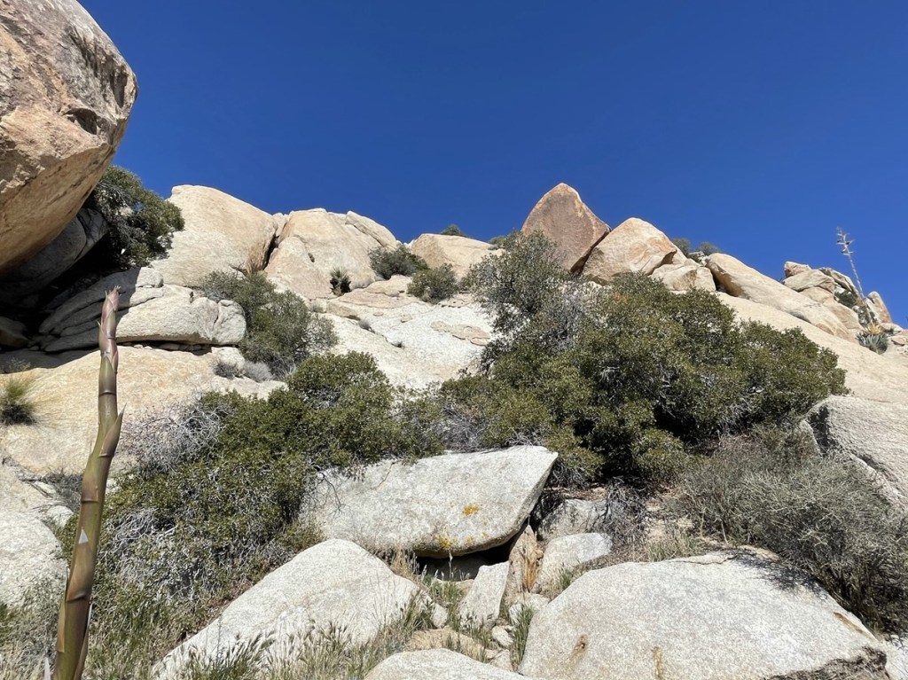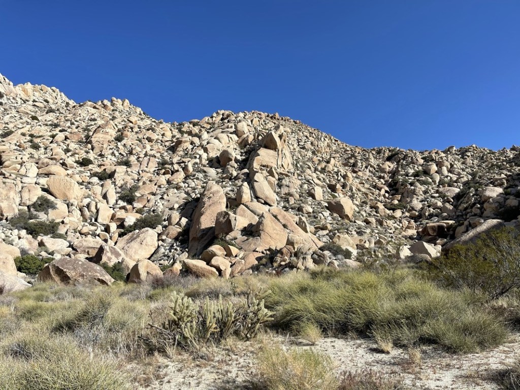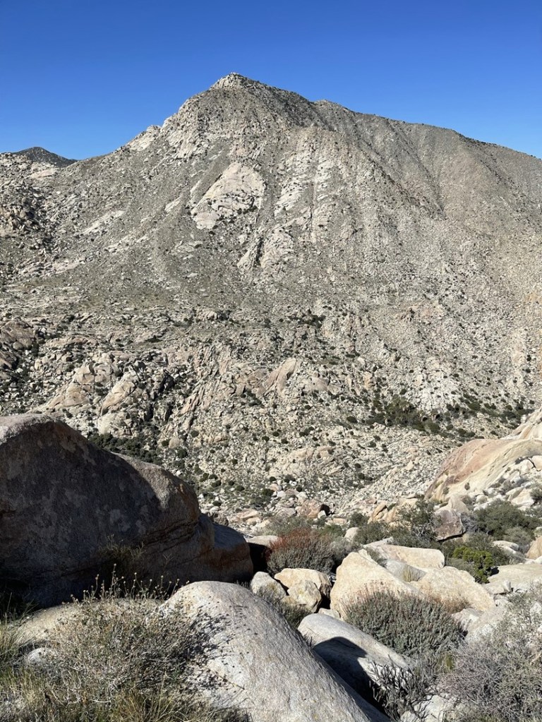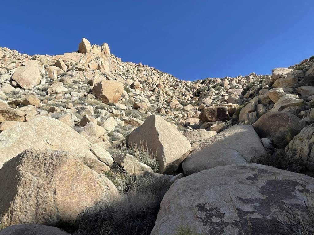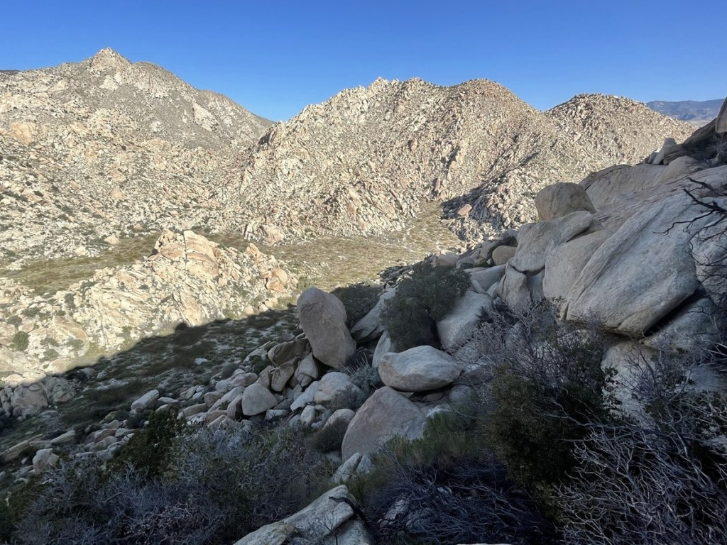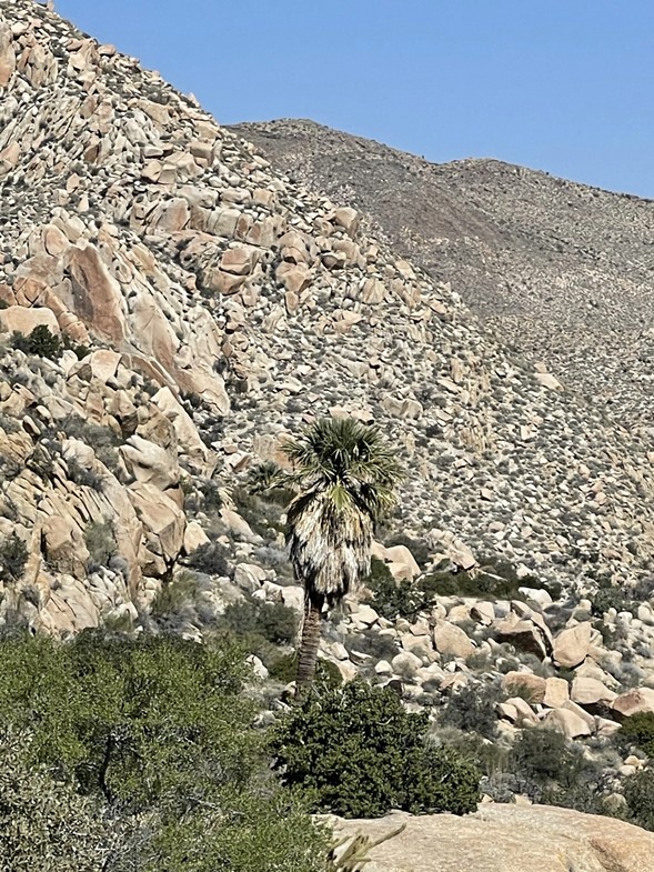 The terrain on the north side of Elder wasn’t as bad so I made decent time down the rocky slope. I could see palm trees in the canyon below.