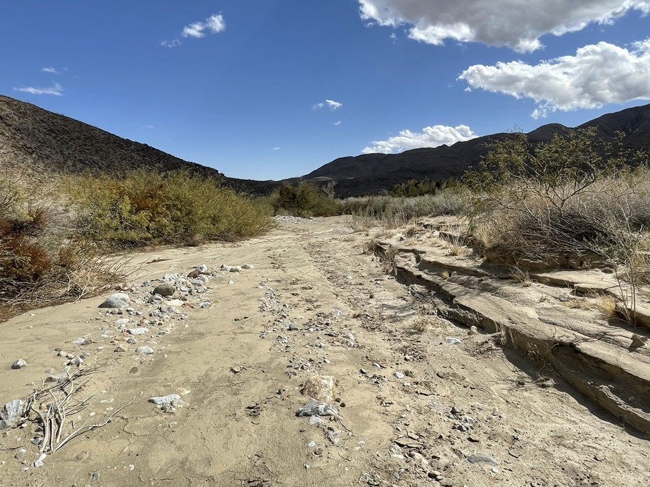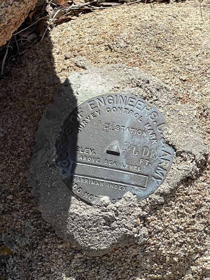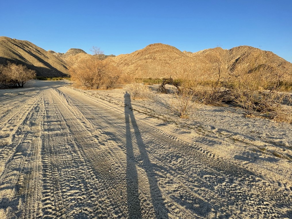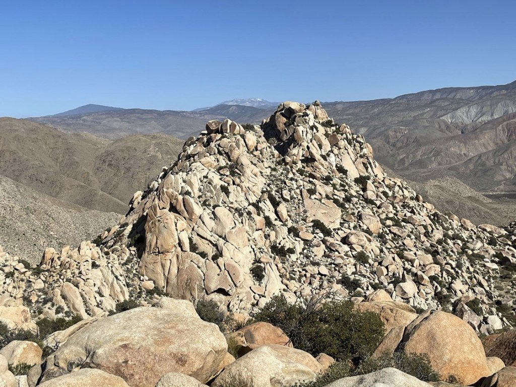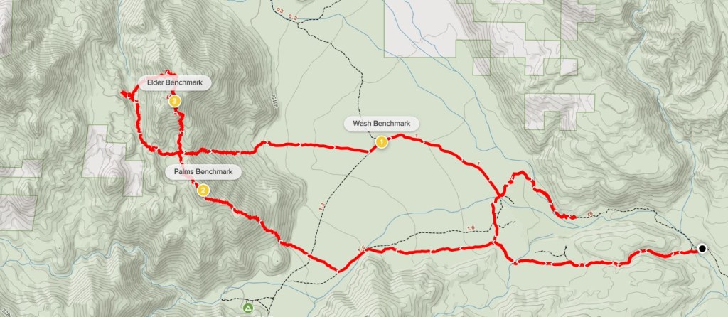 I reached the bottom of the canyon and started ascending towards Collins. I didn’t make it very far when I made the tough decision to turn around. It was very warm, and my progress was so slow on this terrain that I didn’t feel like I had enough water for the whole loop. I was annoyed at myself for not bringing more water, especially since I still felt pretty good and I really wanted to get these remote peaks done while I was all the way out here. The only good news is that Collins and Knob can also be accessed from the west via Lost Valley Road (near the Combs Peak trailhead), so I wouldn’t have to redo this same route to climb those peaks in the future. I took a short break and then started heading back down. I followed the canyon to the south and then turned east into the flat area between Palms and Elder. I then descended directly east down the rocky slope between the 2 peaks to the desert floor, which I reached at 8.4 miles. It had been 3.5 hours since I was on the summit of Elder and I had barely gone 3 miles. I hiked east across the desert until I eventually found Coyote Canyon Road. At 9.3 miles, I found Wash Benchmark just off to the side of the road.
