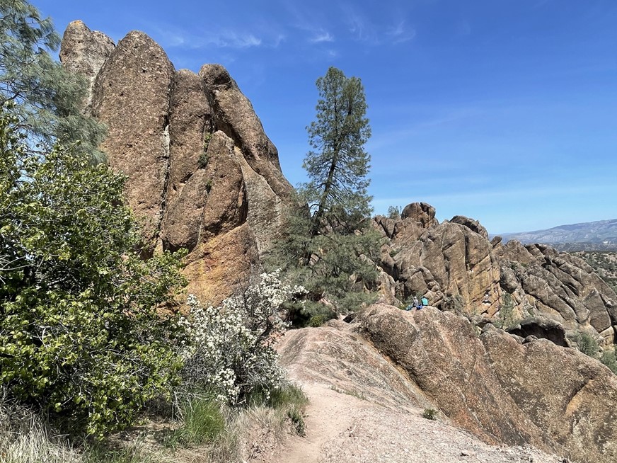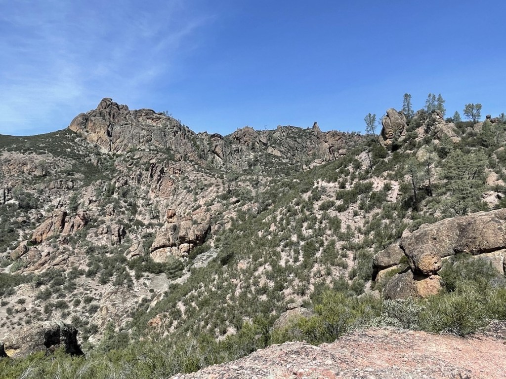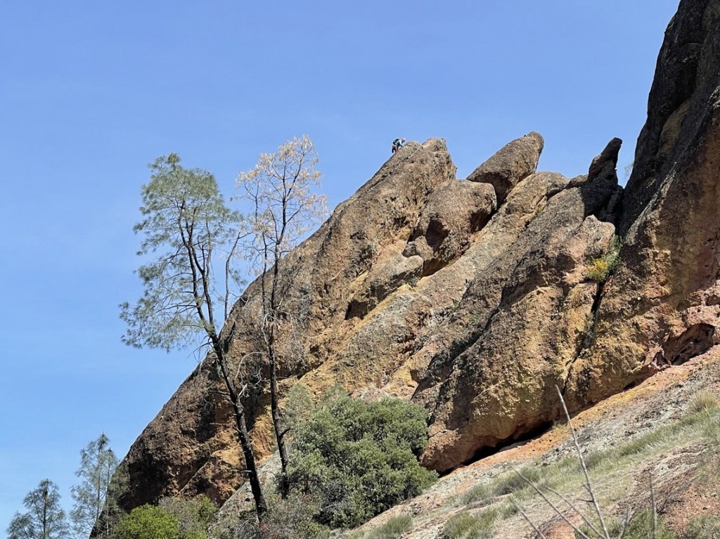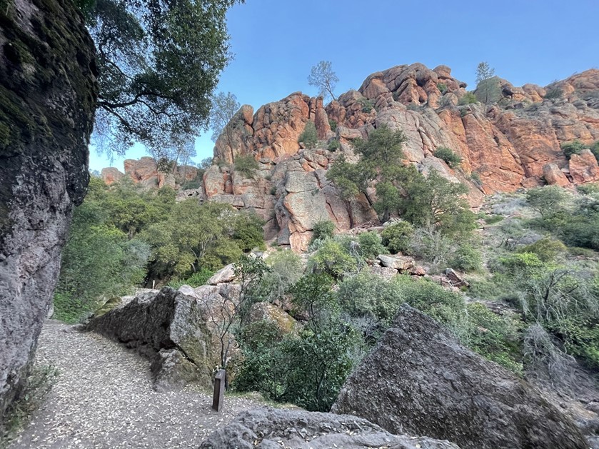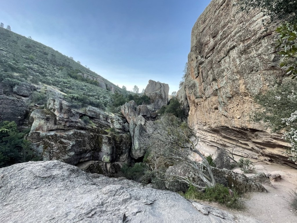 I went over the locked gates again and started descending towards the central part of the park. I passed more groups of hikers on their way up. It was getting warmer but there was still a thin cloud layer that blocked the sun’s full intensity. I noticed a few rock climbers on some of the bigger rocks. Pinnacles is an extremely popular area for rock climbers. I imagine it is a good winter climbing spot for when Yosemite is snowed in.