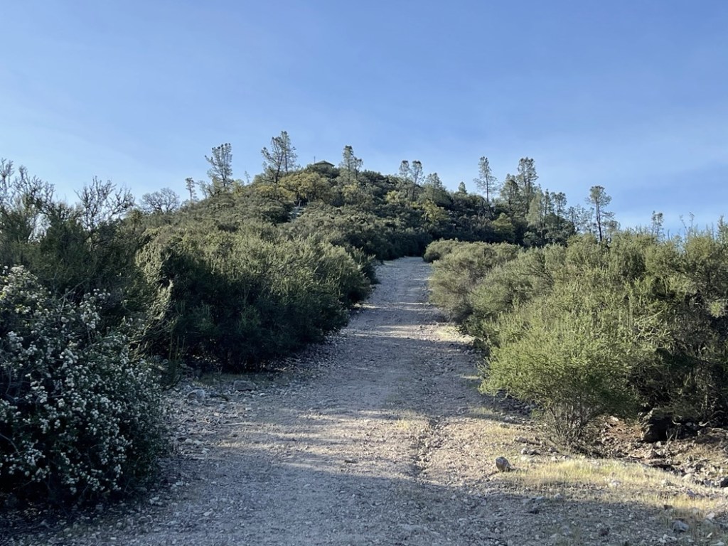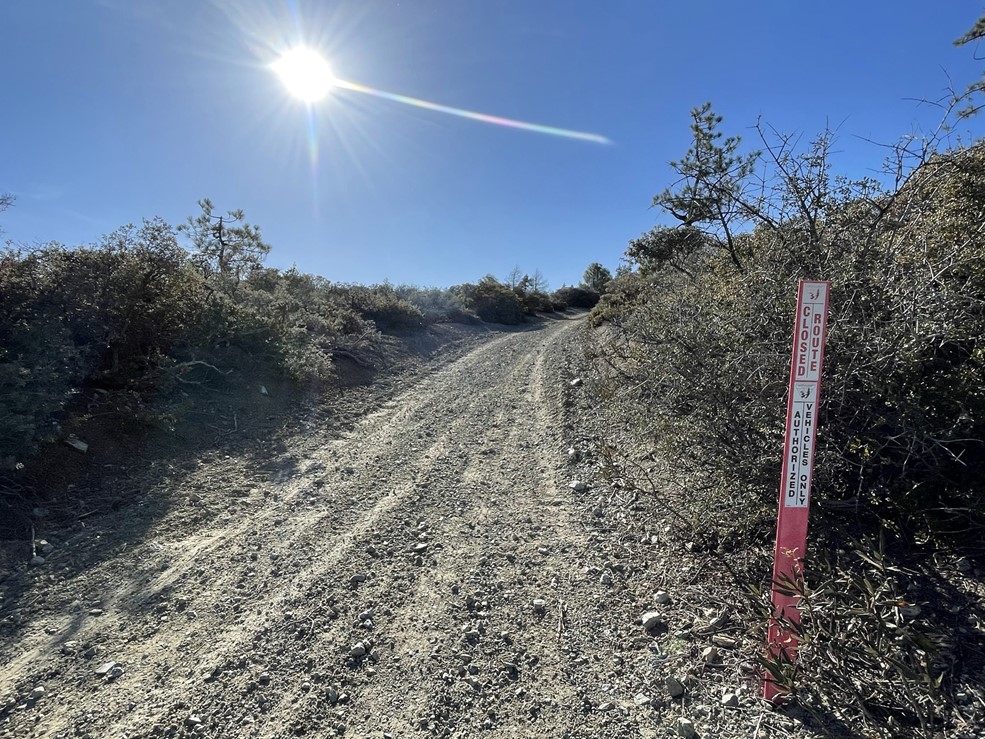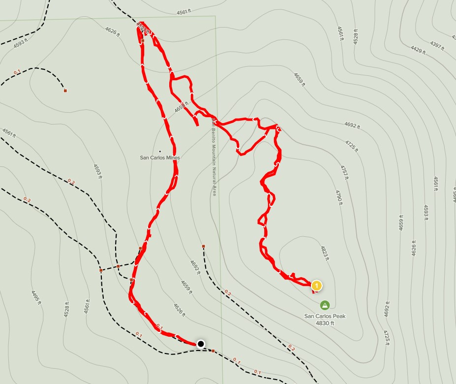 I packed up the car and exited the park. I had been planning to climb Mount Defiance, but this required parking in a different area. It was a Saturday in a national park, so I didn’t want to deal with trying to find parking in mid-afternoon. Instead, I decided to drive out to the Clear Creek Management Area to climb San Benito Mountain, which I had originally been planning to do on Sunday. At 5241 feet, San Benito Mountain is the high point of San Benito County. The mountain lies within Clear Creek Management Area, which is managed by the BLM. Clear Creek contains one of the largest asbestos deposits in the world. Due to health concerns related to asbestos exposure, you must get a permit to enter the area and each individual is limited to 5 permits/year. You must also get a vehicle permit to enter and the 2 permits combined cost $17. One of the permits has the gate code combination on it, and it sounds like the BLM does change this regularly (so I won’t post it here). I don’t believe there is a daily quota on permits, so they are easy to get on online (recreation.gov). I exited the park and took Highway 25 south to Coalinga Road. I drove about 16 miles and then turned left onto Clear Creek Road, which is a dirt road. I drove about a mile or 2 up the road, went past Oak Flat Campground, and then opened the locked gate with the combination code I had printed out. From the gate, it is about 16 miles on decent dirt road to the top of San Benito Mountain. There are tons of old mining roads in the area but thankfully I had downloaded a GPS track of the drive up so I wouldn’t get lost. The roads were in okay shape, but I’d recommend moderate ground clearance and at least AWD for some steep sections in the middle. I wish I had taken some pictures of the drive because this was one of the most bizarre areas I had ever been to. It had an almost otherworldly appearance. Entire hillsides were completely devoid of vegetation and there was an orange tint to everything. There were some forested areas as well at higher elevations. I passed one large group on the way up who seemed to just be hanging out for the day. At about 12 miles I parked to climb a minor peak before heading the rest of the way up: 4845 foot San Carlos Peak. I started this hike at 4:23pm from 4561 feet. I started by hiking up an old mining road.