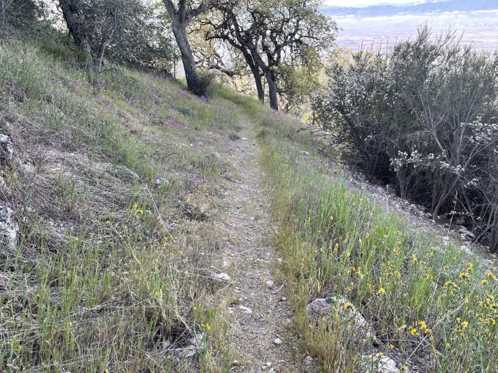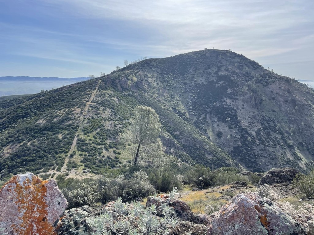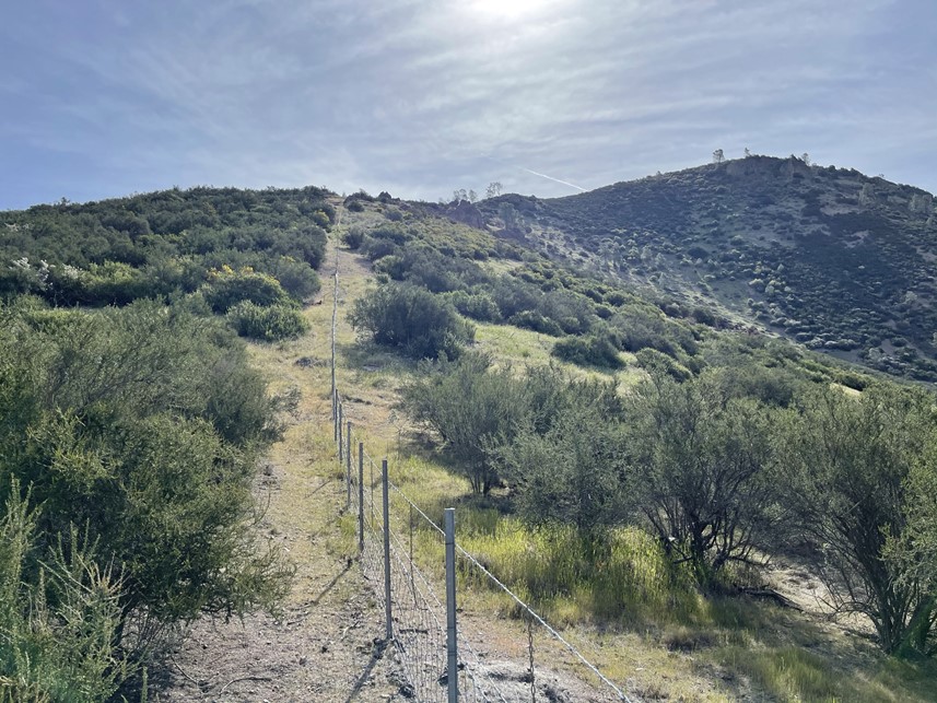 I hiked back around Middle Chalone towards North Chalone. In the below picture, the fence break can be seen going straight up on the left side and the trail can be seen heading up and to the right across the middle.
