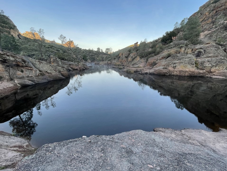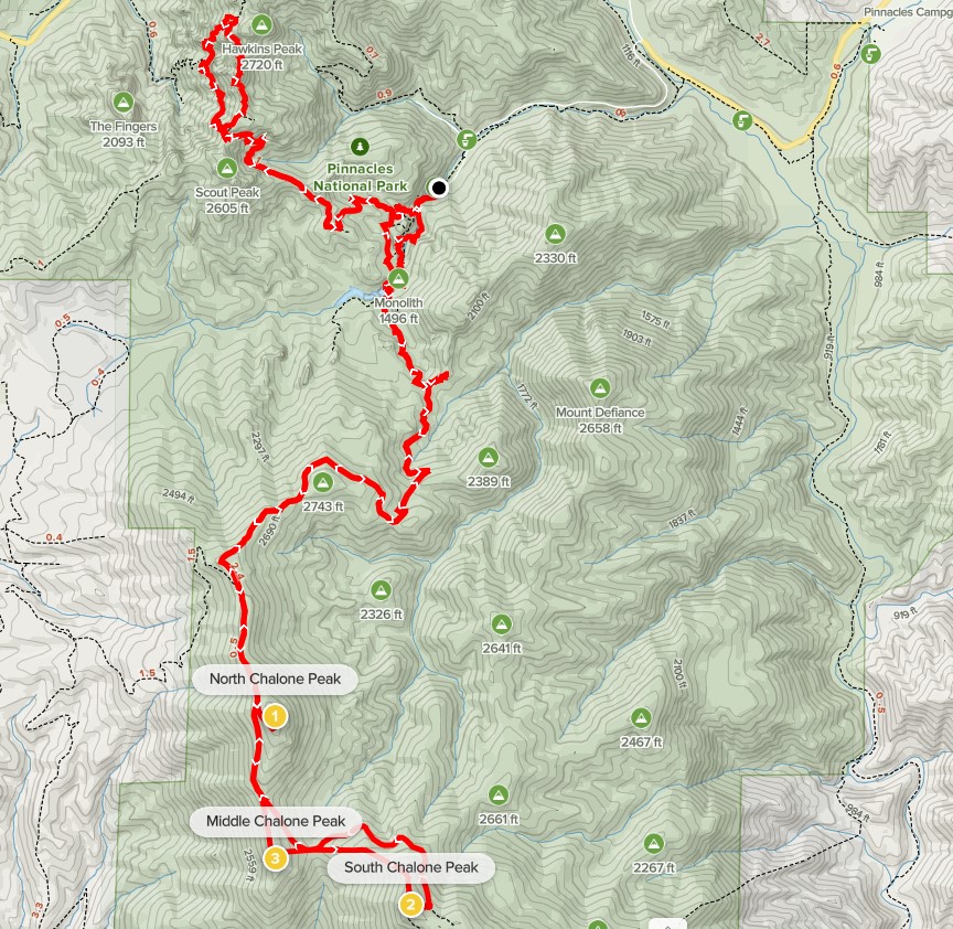 I woke up early Saturday morning and drove from my campsite on Coalinga Road to Pinnacles National Park. Pinnacles was the only national park in California that I hadn’t been to, so I was very excited to check it out. I saw a gray fox just inside the park boundary as I was driving in. It was the 2nd gray fox I had seen on this trip (the other was also early in the morning while driving). Foxes are nocturnal so they are very rarely seen. My plan today was to climb North Chalone Peak (3304 feet) and South Chalone Peak (3269 feet), and then do a loop through the main part of the park on the High Peaks Trail. I parked at the Bear Gulch Picnic Area and began hiking at 6:51am from 1303 feet above sea level.