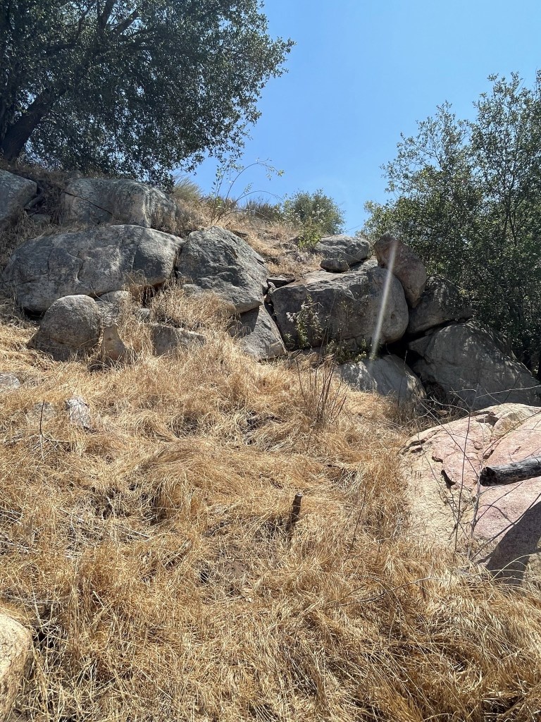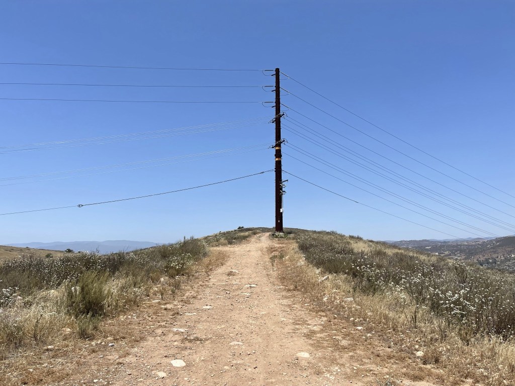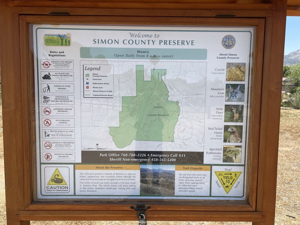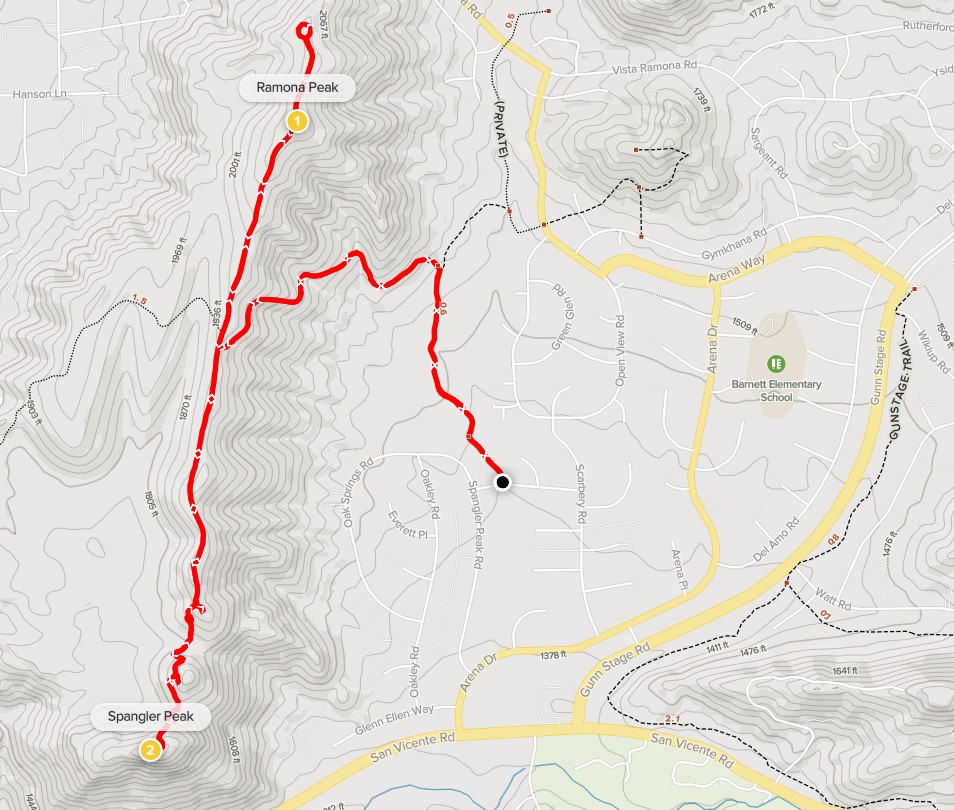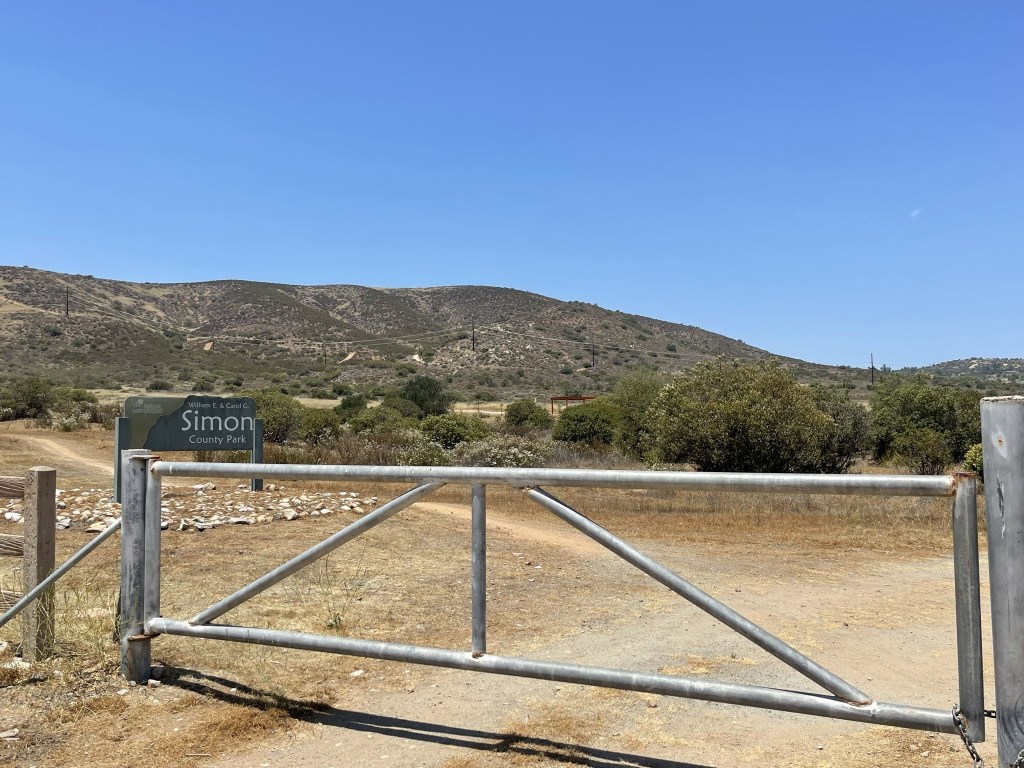 I decided to get out on Sunday afternoon for a quick hike before the weekend was over. I settled on doing Ramona Peak (2128 ft) and Spangler Peak (1984 ft), two insignificant little bumps southeast of the town of Ramona. Both are located in Simon County Park, which contains a nice network of trails that begin in a suburban neighborhood. I parked on the side of the road on Bassett Way near a dog park. There appeared to be some construction going on but thankfully the signs indicated that parking was okay on the weekends. It was 90 degrees when I arrived, so I knew I was in for a hot day. I started hiking at 1:04pm from 1415 feet above sea level.