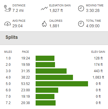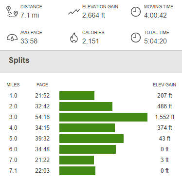 It was just another half mile and then I reached my car once more at 11:05am. Totals for this hike were 7.1 miles, 2664 feet elevation gain, and 5:04:20 total time.