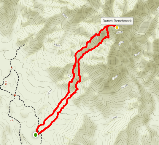 Next up was Bunch Benchmark. I drove back out to the Bradshaw Trail and turned left. I proceeded east on the Bradshaw Trail for about 15 miles to Graham Pass Road. The Bradshaw Trail is well graded, and I could go 20-25 mph for most of it. Immediately after turning onto Graham Pass Road, I turned left onto a faint dirt track and drove about 1.5 miles to the base of the mountain. This road was also in good shape.