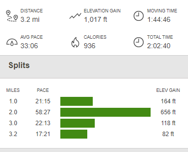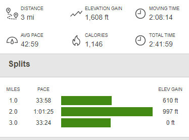 I finally reached the car again at 4:10pm. This hike was 3 miles, 1608 feet elevation gain, and 2:41:59 total time.