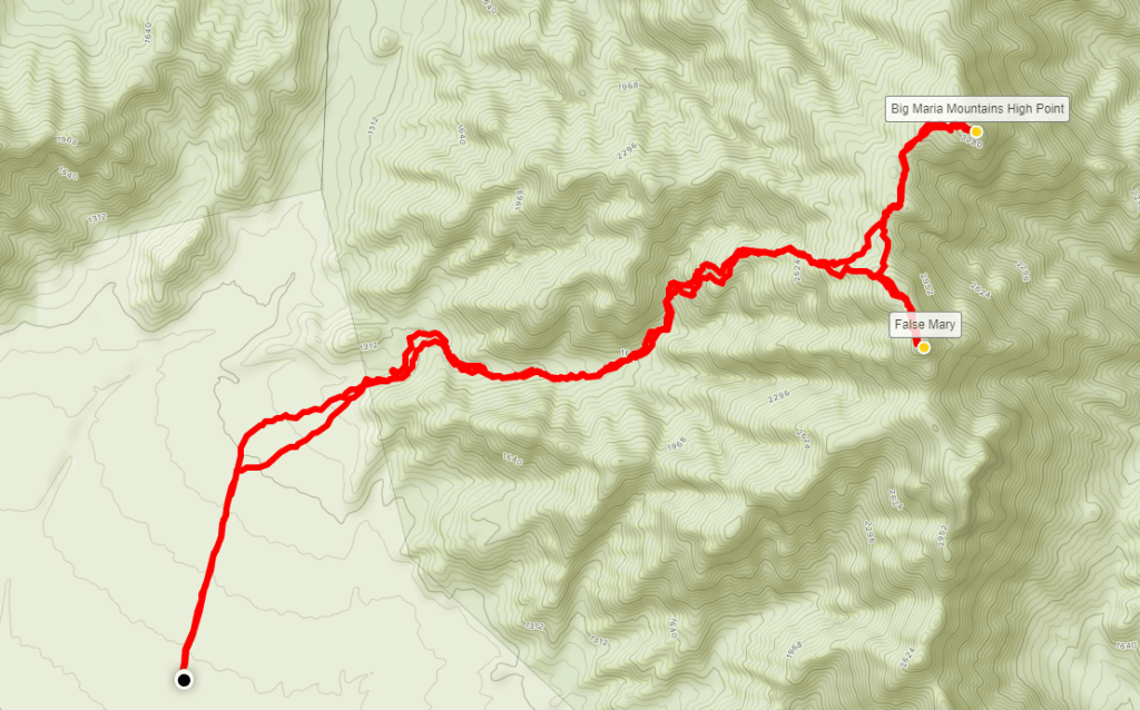 I was at about 3000 feet on the saddle. Big Maria actually has 2 summits. The north summit is the true summit at 3381 feet. The south summit, often referred to as False Maria, is only 1 foot lower. I started towards False Maria first. The 300 foot climb was pretty easy, and I reached the summit at 8am. It was 3 miles of hiking so far.