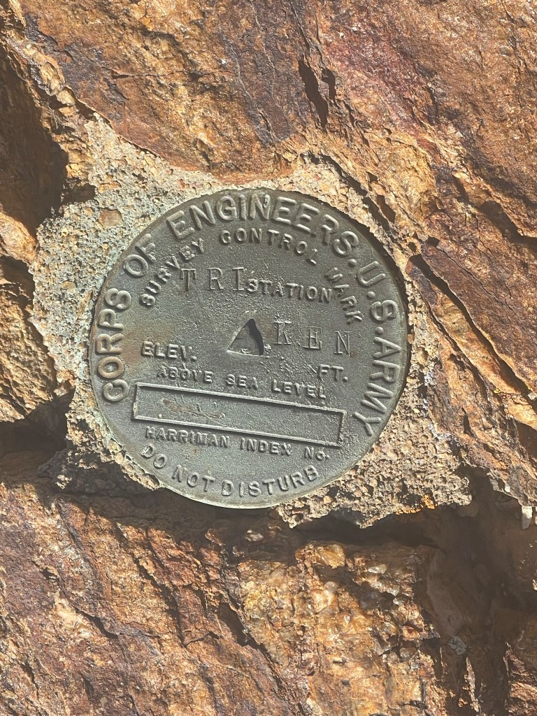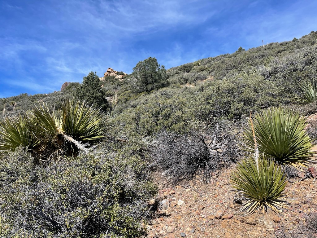 I hiked southeast for a little over a mile as the narrow trail followed the ridgeline. The trail eventually turned into an old road as it neared Ken Point. I left the road and climbed the remaining 300 feet through low density brush. I reached the summit at 2:42pm at 9.6 miles! I signed the register which was placed in February. There were only 4 previous entries, and it was most recently signed in August. I located a US Army benchmark.