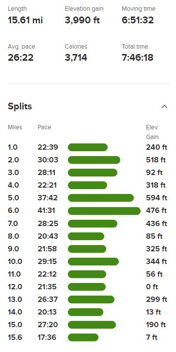 I descended directly south to the road and then hiked back to my car, which I reached at 5:14pm. Stats for this hike were 15.61 miles, 3990 feet elevation gain, and 7:46:18 total time.