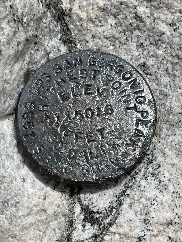 Once again there was a container but no register inside, but that really didn’t surprise me on such a popular peak. Dozens of people summit San Gorgonio every day in the summer, and there were 15-20 people on top when I was there. I located one benchmark.