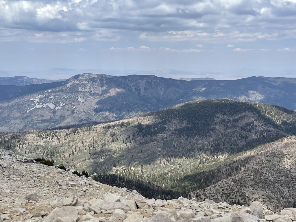 I continued on and reached Carmen Peak (10075 feet) at 4 miles. There was a register inside a large ammo container. It was placed in 2008 and most recently signed on July 25. The first entry indicated that the peak was named for someone’s mother who had passed away.