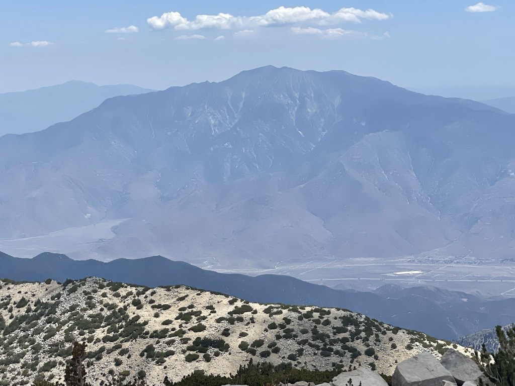 San Gorgonio is the 7th most prominent mountain in the contiguous United States, so it commands tremendous views in every direction. Unfortunately, clouds and haze obscured the views somewhat. To the north I could see Sugarloaf Peak (left) and Grinnell Mountain (right foreground).
