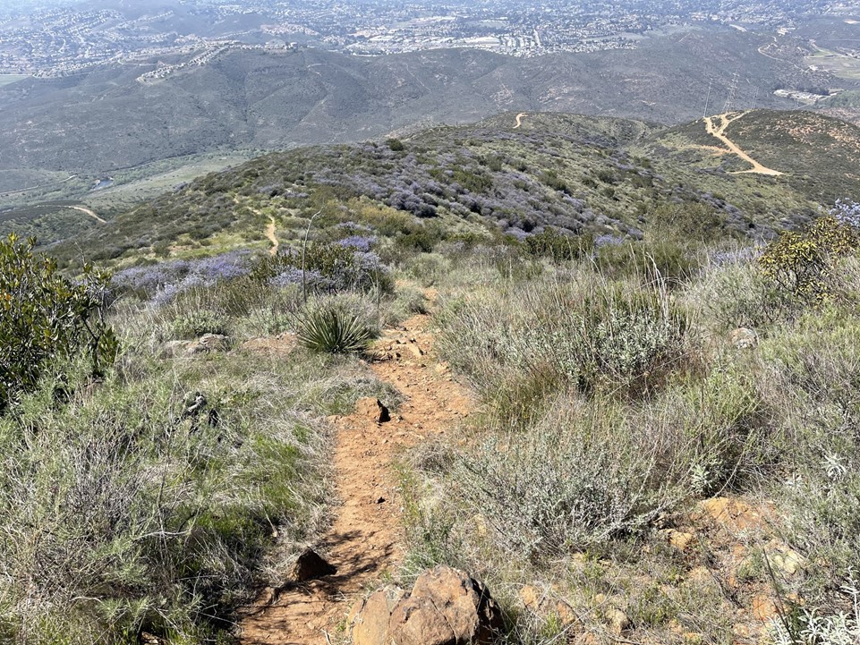 I did a lap around the fence while searching unsuccessfully for survey markers. Most appeared to be inside the fenced area but the 2 that should have been outside weren’t there. I also didn’t even bother looking for a register. The views were pretty good despite some haze. Otay Mountain was just a few miles south. I could clearly see the road leading to its summit from the north.
