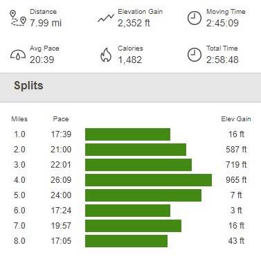 It was just over a mile back to the trailhead from this point. I actually wouldn’t recommend crossing the bridge here as you have to hike by a waste treatment plant (or something like that) on this side of the river. The trail on the east side the river (my ascent route) was much more pleasant. I reached the car again at 3:36pm. This hike totaled 7.99 miles, 2352 feet elevation gain, and 2:58:48 total time.