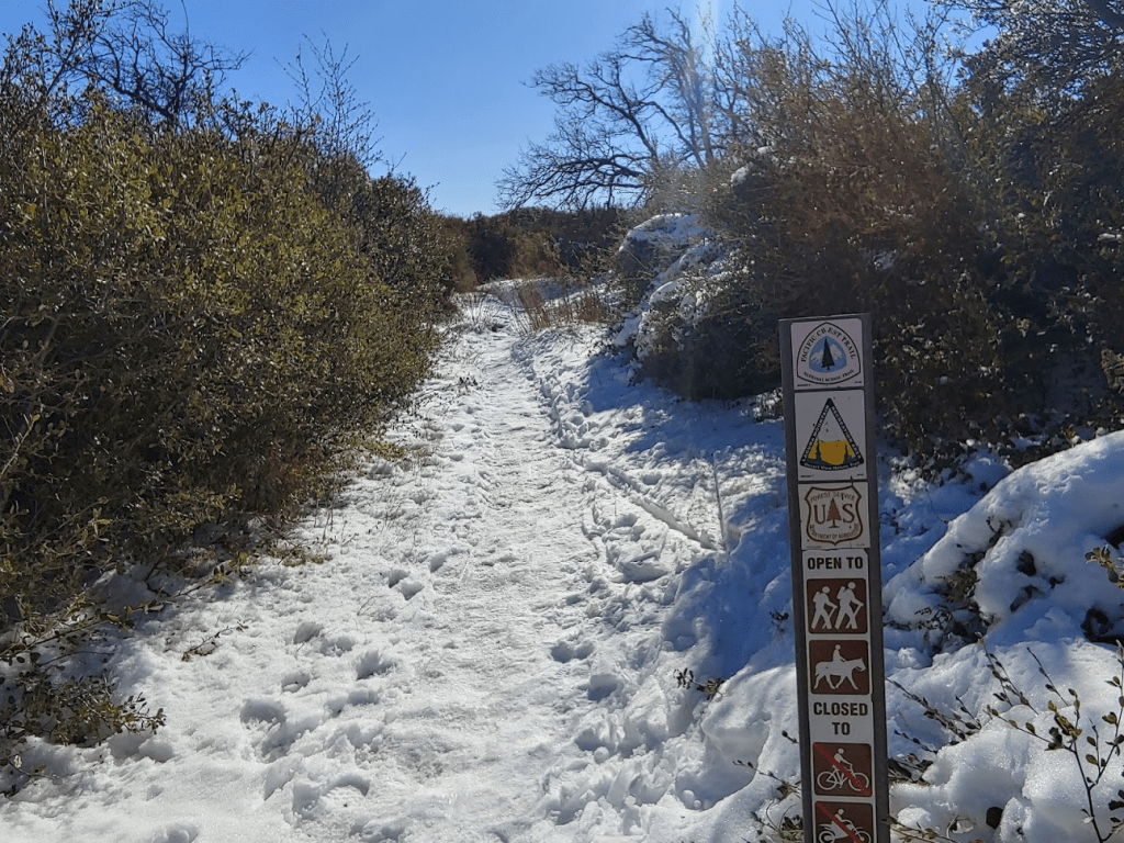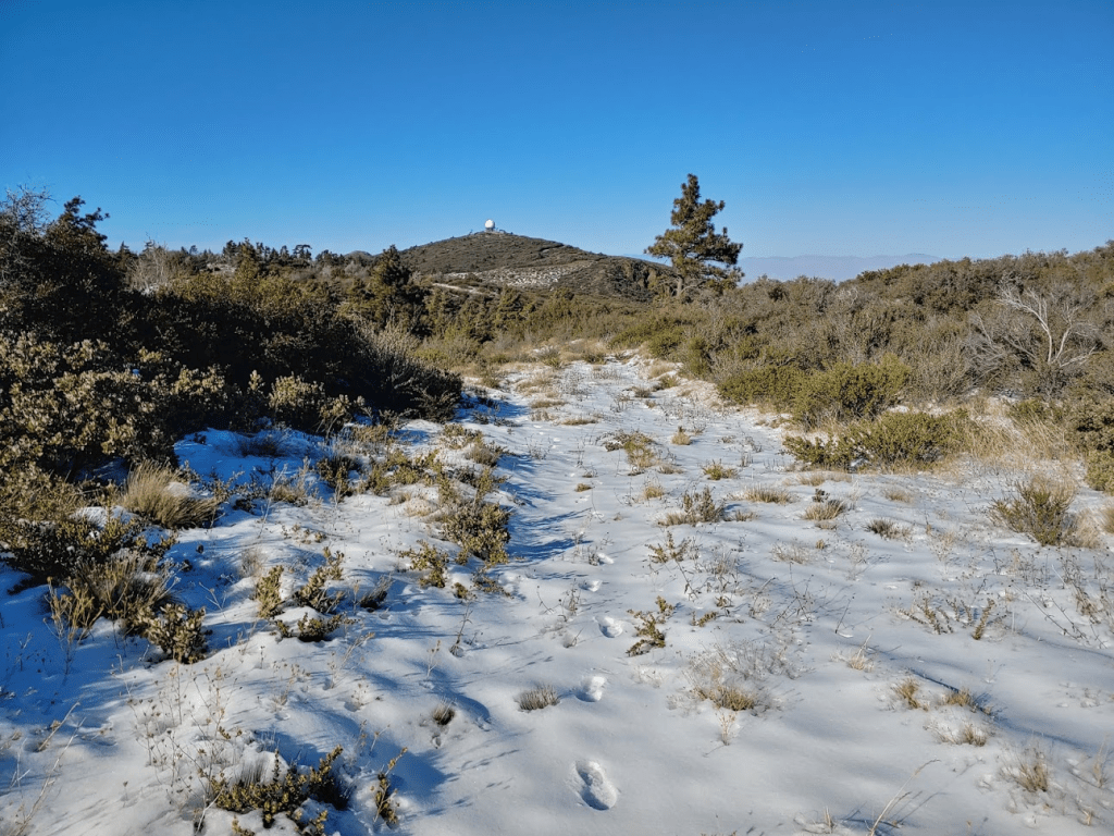 We had just had our first major winter storm in San Diego on Monday, so I decided to drive up to Mount Laguna to check out the snow. I had already climbed most of the notable peaks in the area, but there was still one that had eluded me up to this point: Sawtooth Mountains Wilderness High Point (5960 feet). The Sawtooth Mountains are a very small desert range that lie between Anza Borrego Desert State Park and the Laguna Mountains to the west. Oddly, the wilderness boundary extends beyond the Sawtooth Mountains, so the high point is significantly higher than actual mountain range. The high point is located near the crest of the Laguna Mountains just outside of the Cuyapaipe Indian Reservation. This is one of those peaks that isn’t a peak at all – it is simply a point on the edge of the wilderness boundary that happens to the highest. I left San Diego around 8:30am and made the 1 hour drive to the mountains. The snow began around the 5000 foot level and was a few inches deep by the time I reached Mount Laguna. There were already dozens of cars parked along the side of the road, with countless families playing in the snow, sledding, building snowmen, etc. I intended to start from the Desert View Picnic Area, but the parking lot was full, so I had to park on the road. I started hiking at 9:45am from 5886 feet. I walked through the parking lot and onto the Desert View Trail on the far side.