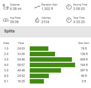 Near the parking lot I walked past a couple arguing on the trail. The girl was screaming at the guy. They were positioned so that the guy saw me coming and the girl was facing the other way. The guy saw me, started grinning and yelled out “Married?” I said “No” and he replied “Enjoy!” Not wanting to get caught in the middle, I held in my laughter until I had passed them. I reached the parking lot soon after that and arrived back at my car at 2:18pm. This hike totaled 6.08 miles, 1302 feet elevation gain, and 4:33:25 total time.