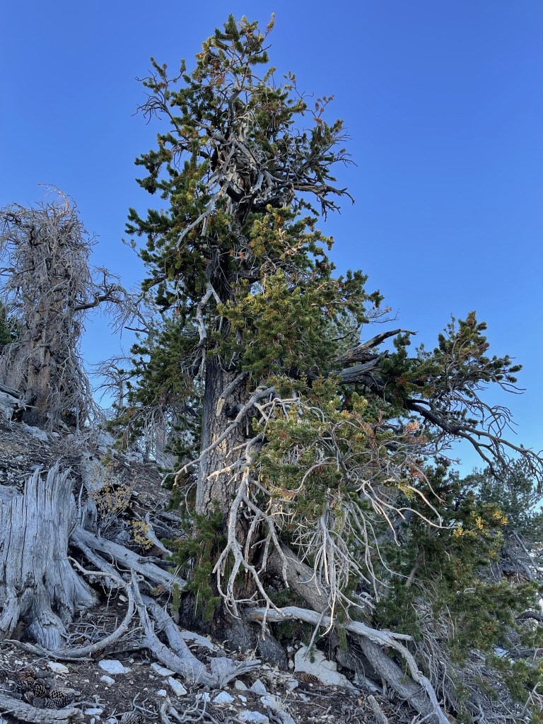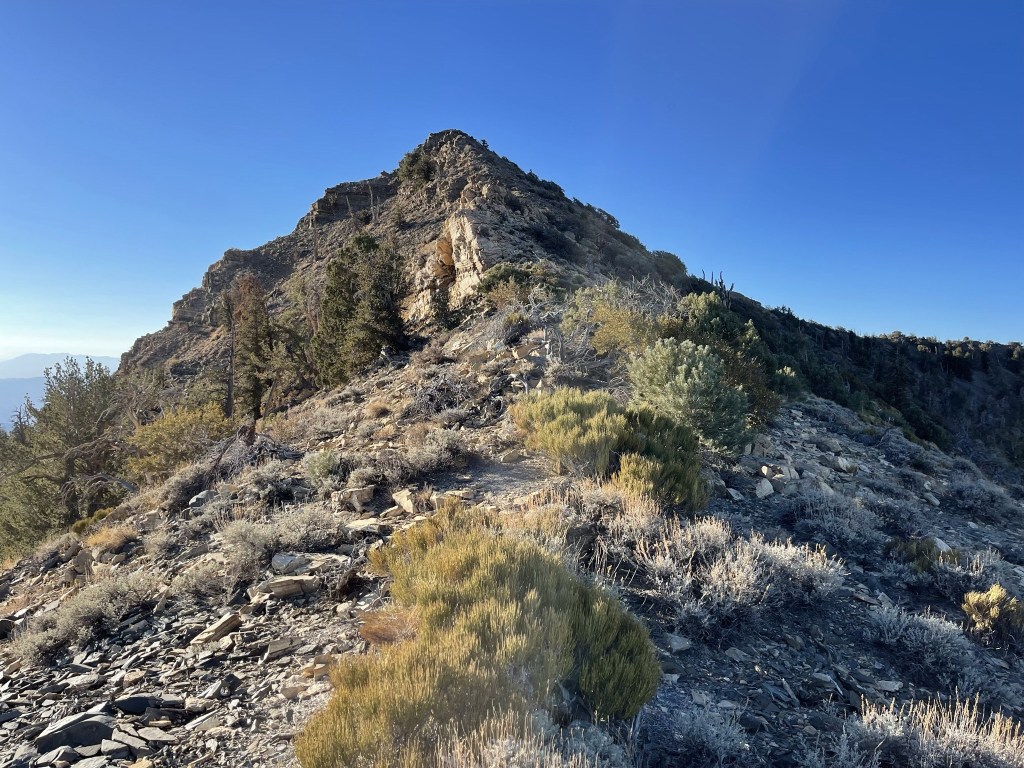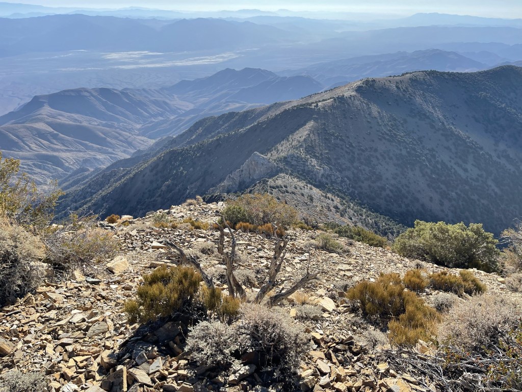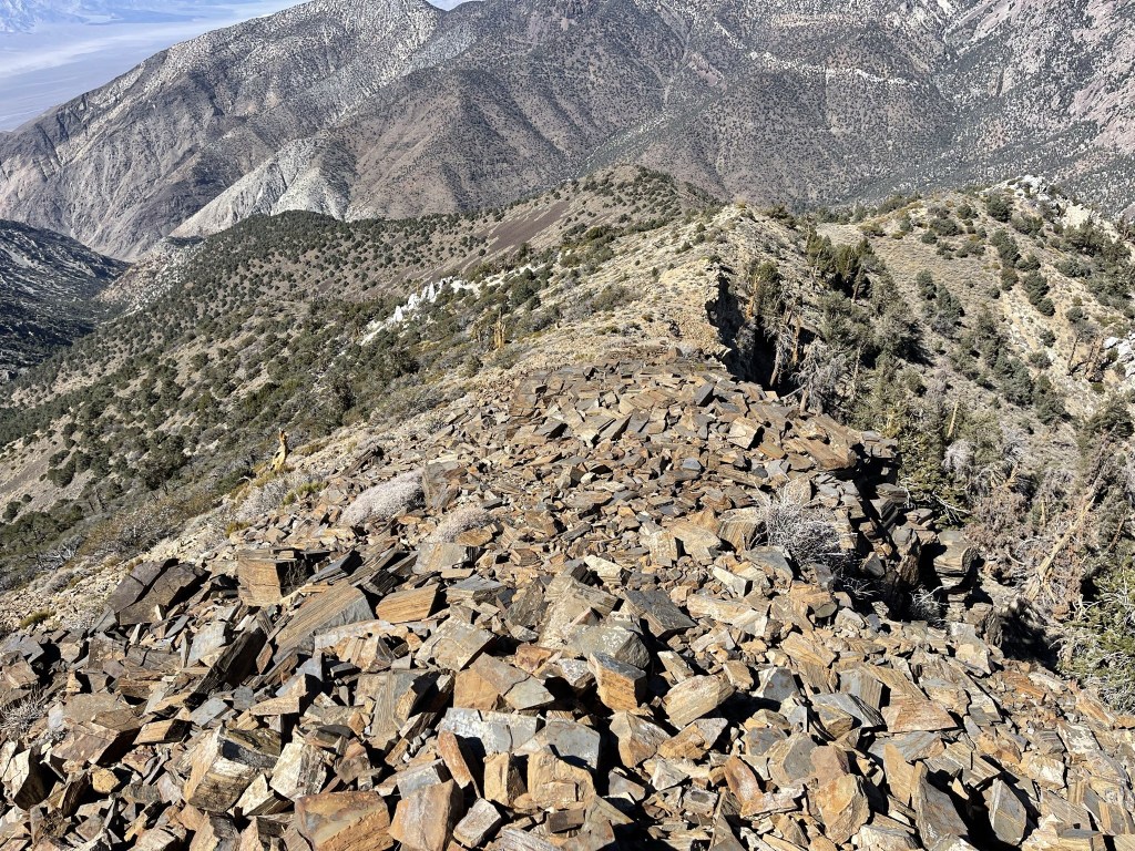 I noticed some bristlecone pines starting around 9300 feet. Bristlecone pines are the oldest living things on Earth, and they only grow in the highest elevations of desert mountain ranges in California, Nevada, and Utah. I knew that they grow on the upper slopes of Telescope Peak, but I guess Sentinel is also just high enough to support a small grove of them near the top.