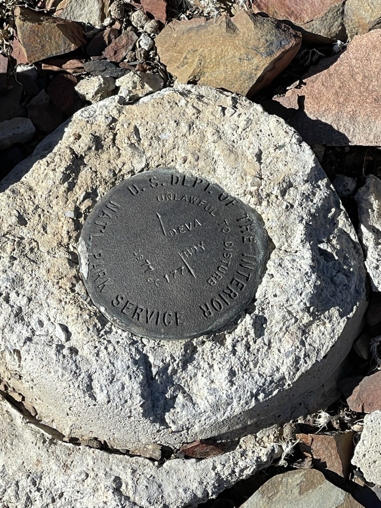 It was pretty chilly this early in the morning, so I bundled up to stay warm. I signed the register which had been placed in 1997. The previous entry was from April 25 which meant I was the first one up here since Spring. I located 2 “Panamint” reference markers but did not find the benchmark.