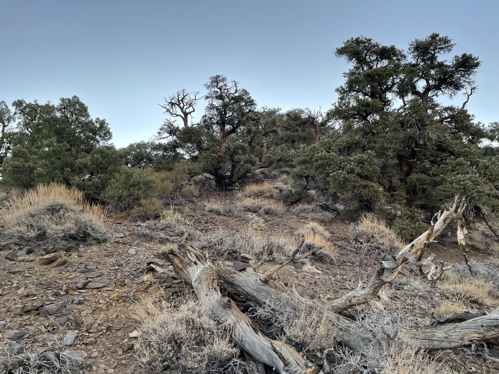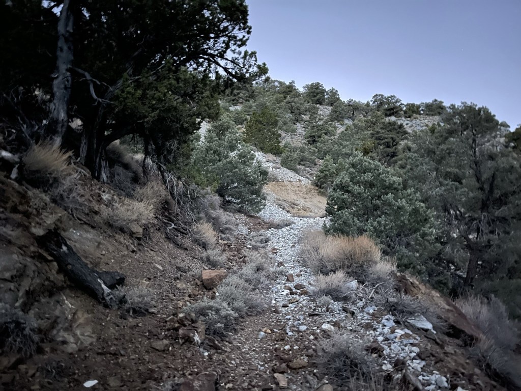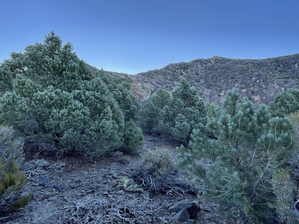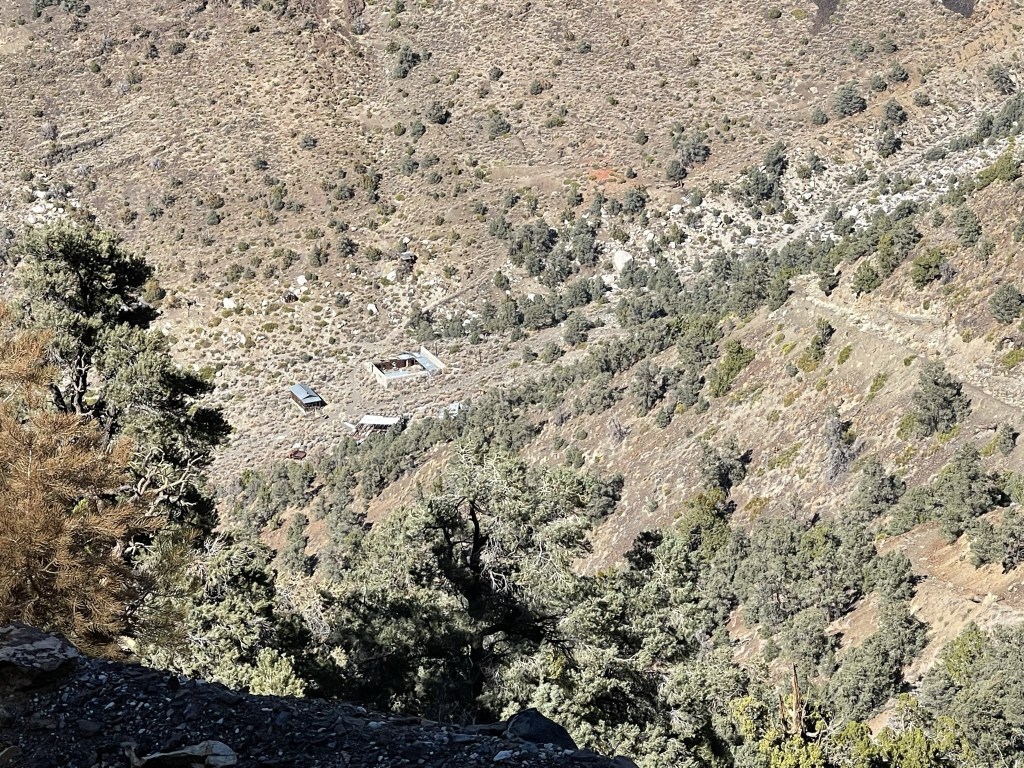 I descended to 8600 feet and then made the final 500 foot push to Porter. I saw a large animal way off in the distance. It had things sticking out of its head which I’m pretty sure were antlers (instead of horns), so I think it was a large buck. I also saw burro poop everywhere but did not see any actual burros. I knew that burros were all over the place in Death Valley but did not realize they ventured up this high.