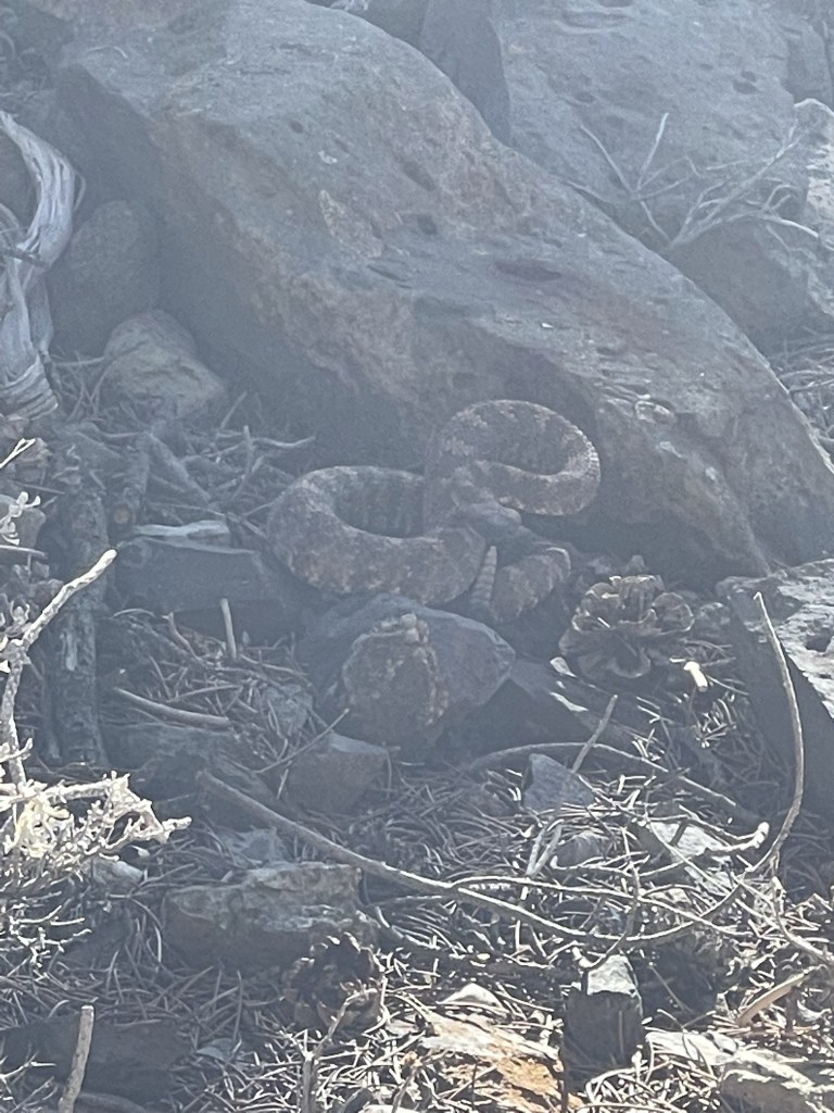 I hiked down the road back to Panamint City. At 14.6 miles I heard a loud rattle and saw a large rattlesnake on the side of the road. I was thankful that I didn’t step on this guy. He was curled up and ready to strike.