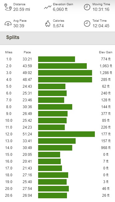 I made it back to the trailhead at 5:40pm. The couple I had seen the day before were still there, so I chatted briefly with them before departing. Today’s hike totaled 20.59 miles, 6060 feet elevation gain, and 12:04:45 total time.