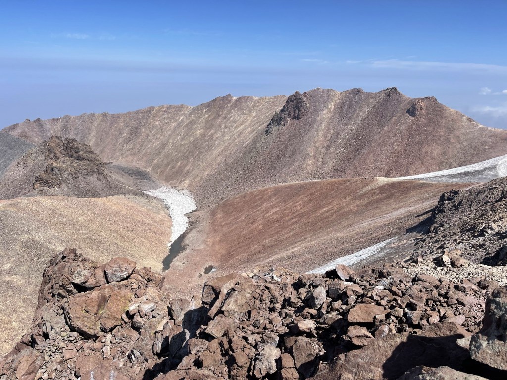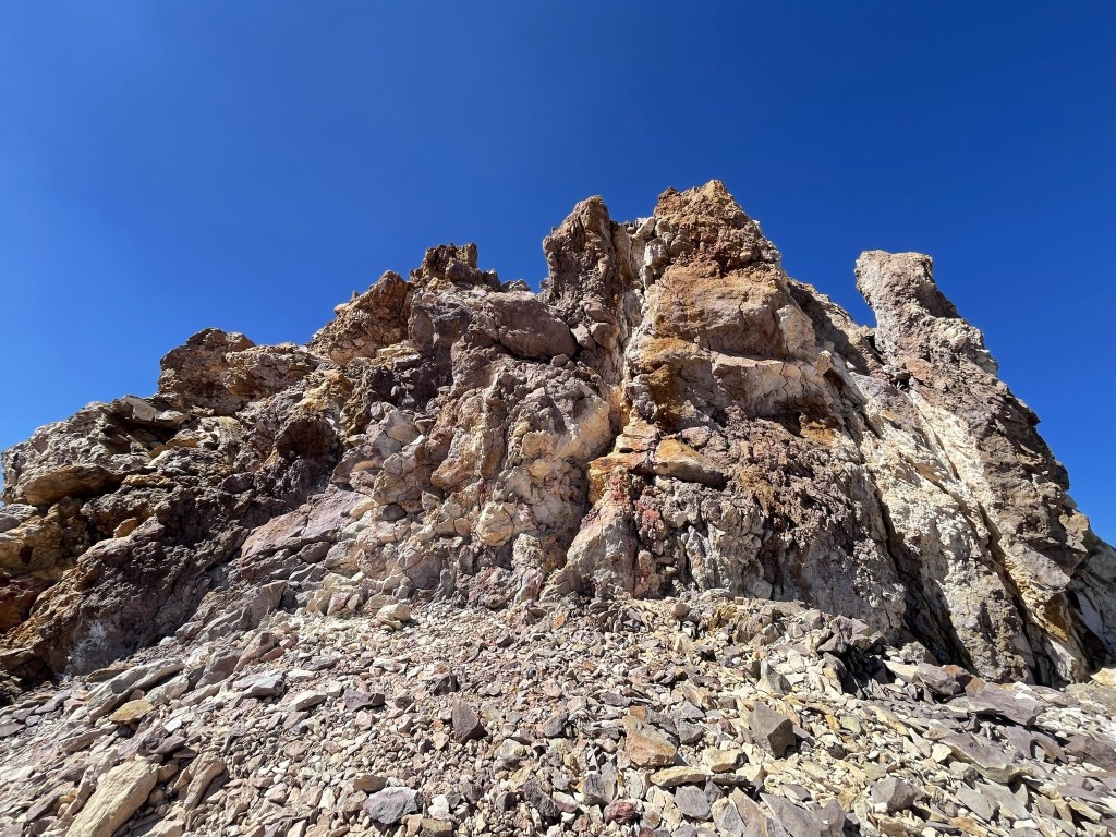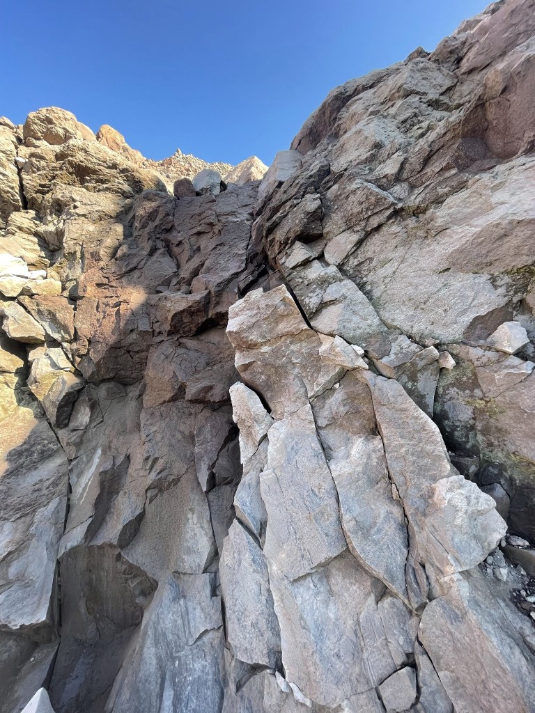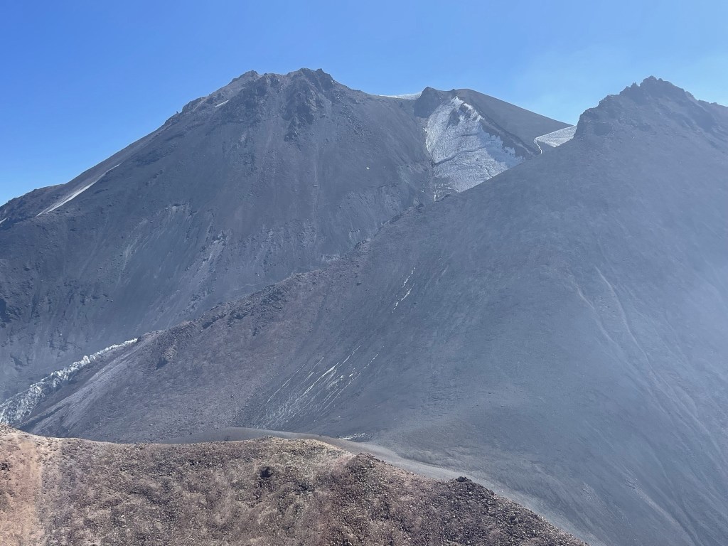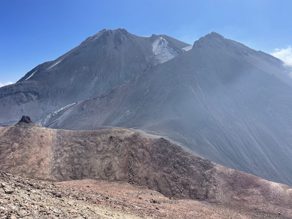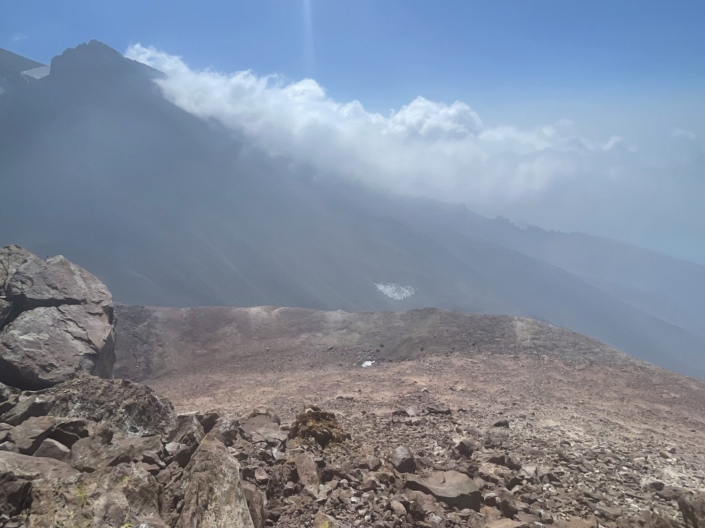 It was steep but the mountain was surprisingly solid, especially compared to some of the Sierra peaks I had climbed recently. At 5.1 miles I reached the saddle between Shasta and Shastina at 11857 feet. This is looking east towards Shasta, still over 2000 feet above: