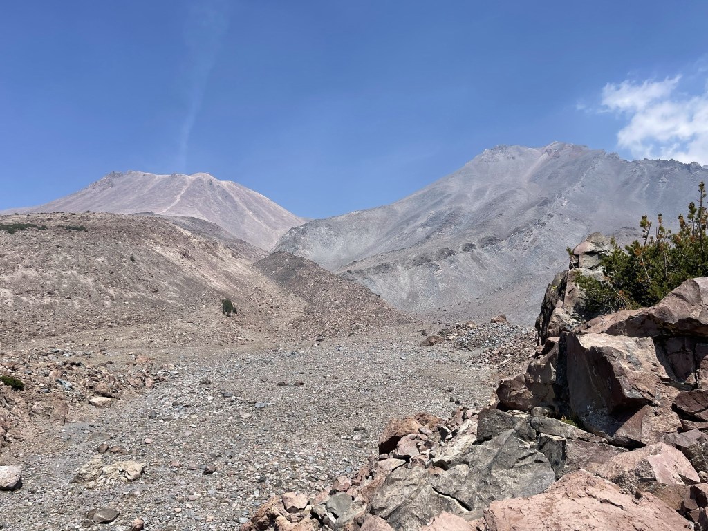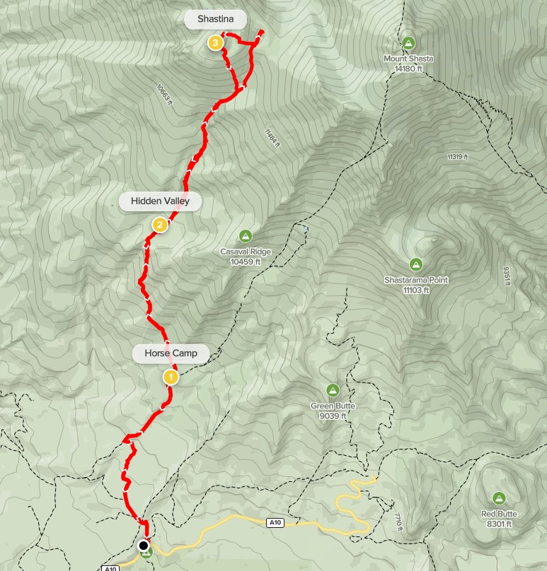 This is where the Avalanche Gulch and Cascade Gulch routes split up. The Avalanche Gulch route heads northeast from here, while the Cascade Gulch heads more directly north towards the saddle between Shasta and Shastina. The Cascade Gulch route first goes through Hidden Valley.